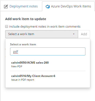 In the text field, Gearset will automatically search your work items as you type - all you need to do is add any items you’d like associated with the deployment. You can also choose to include deployment notes within your work item comments too for added context of what changes are being made.