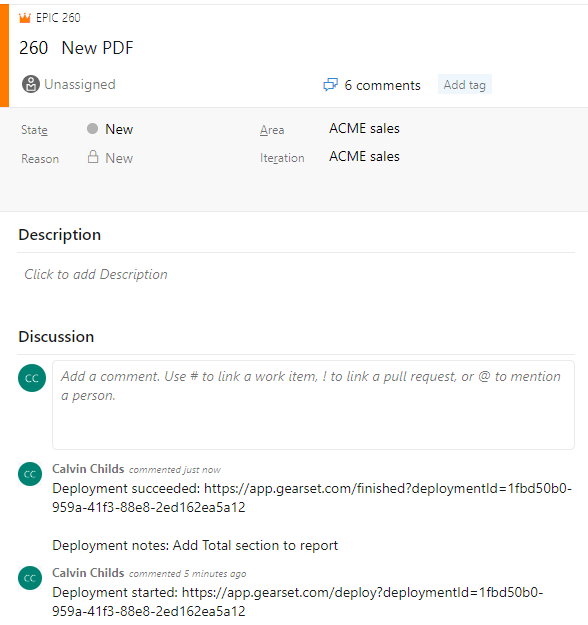 When a deployment starts or finishes, Gearset will then add a comment to each associated work item, linking to the deployment. If you chose to include deployment notes, these will also appear in each item.