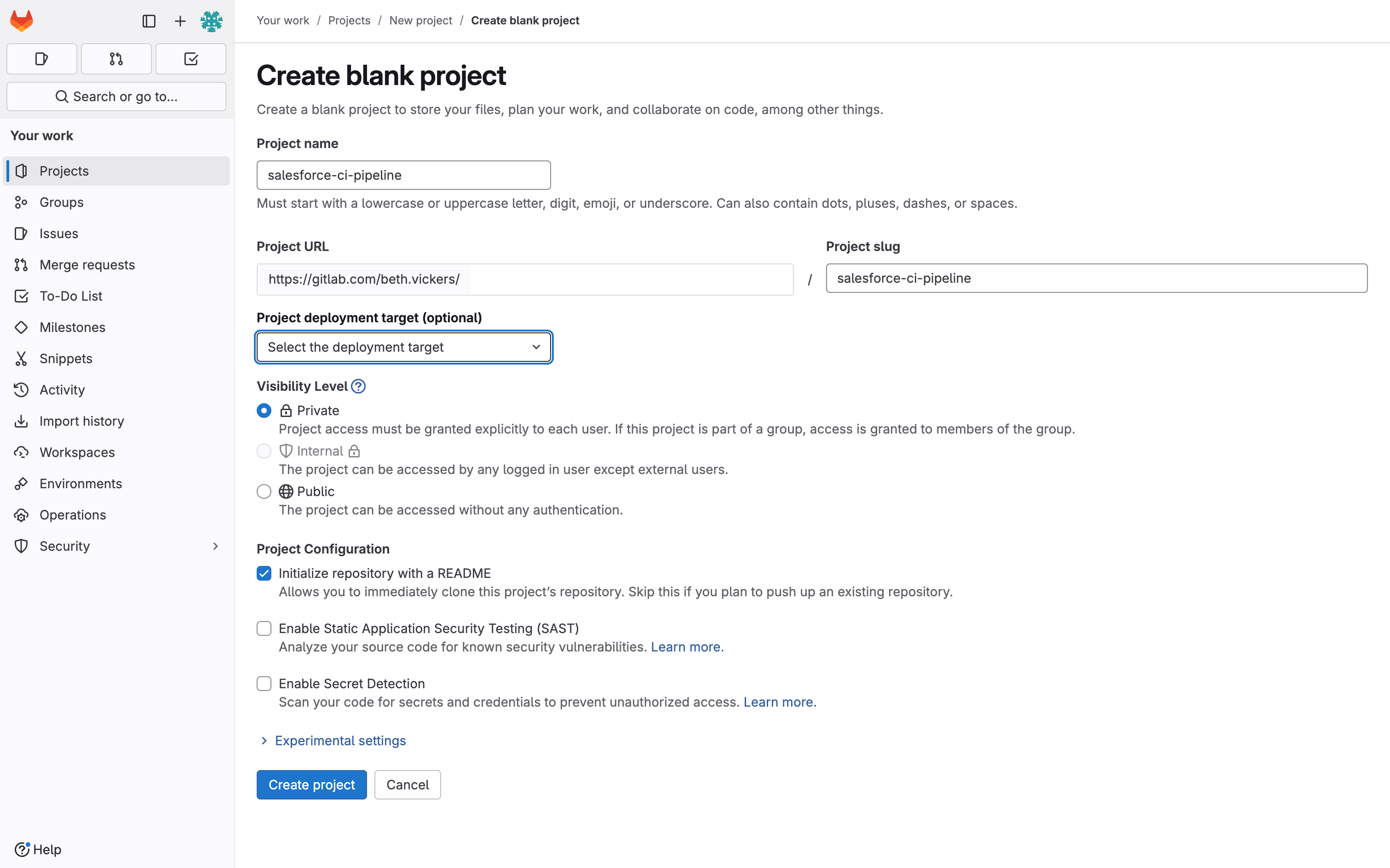 Log in to your GitLab account. To create a new GitLab project, select New project. Choose whether to start from scratch, create from a template, or import an existing project. Name your project and set its visibility.