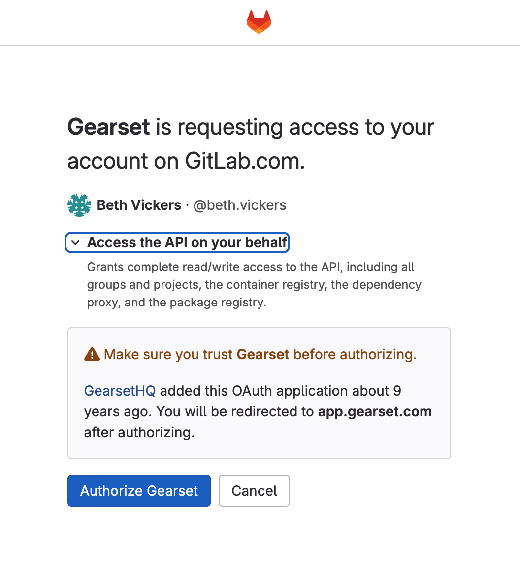 Connect to GitLab will take you to GitLab’s OAuth page for authentication. Check that your organization has given Gearset access to your repo. Once you have access and are ready to connect to Gearset, click Authorize.