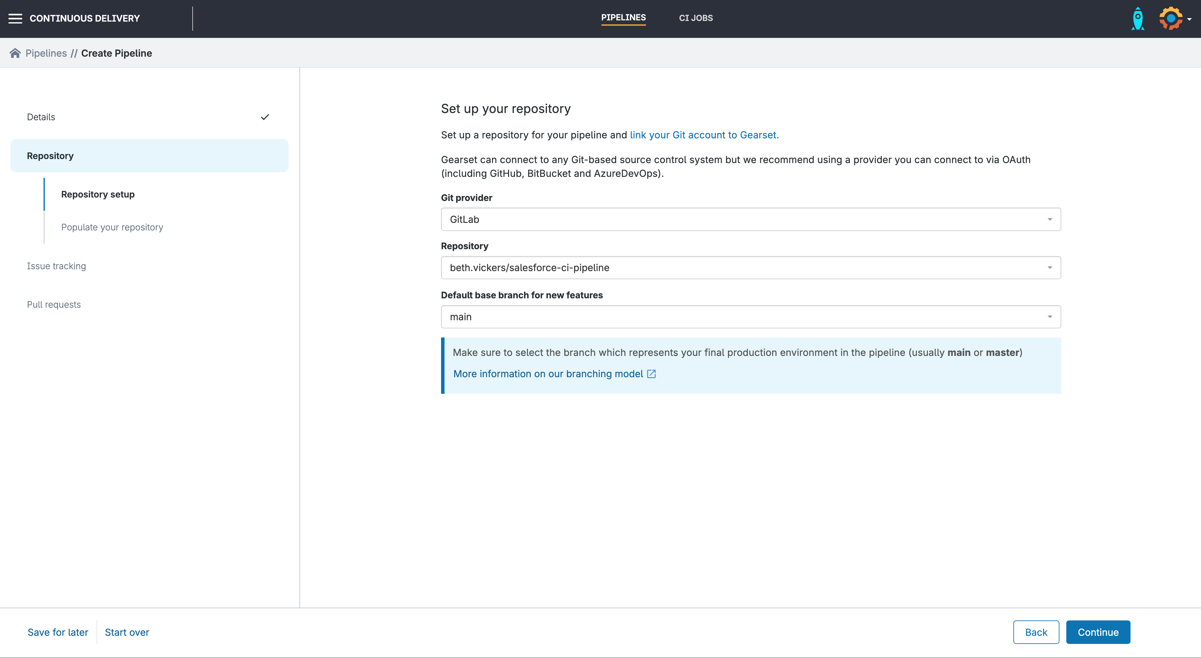 Once you’ve connected your GitLab account to Gearset, you can create your pipeline. Under Continuous Delivery in the left-hand side menu, select Pipelines, then click Create new pipeline +. Follow the prompts to name your pipeline, set access permissions, and configure issue tracking.