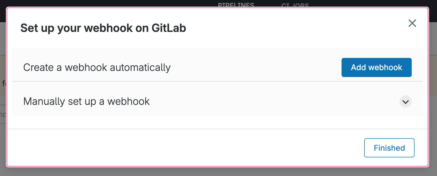After creating your pipeline, click Add webhook to generate one automatically, or choose to set it up manually. This allows Gearset to sync with your GitLab repositories and branches in real-time.