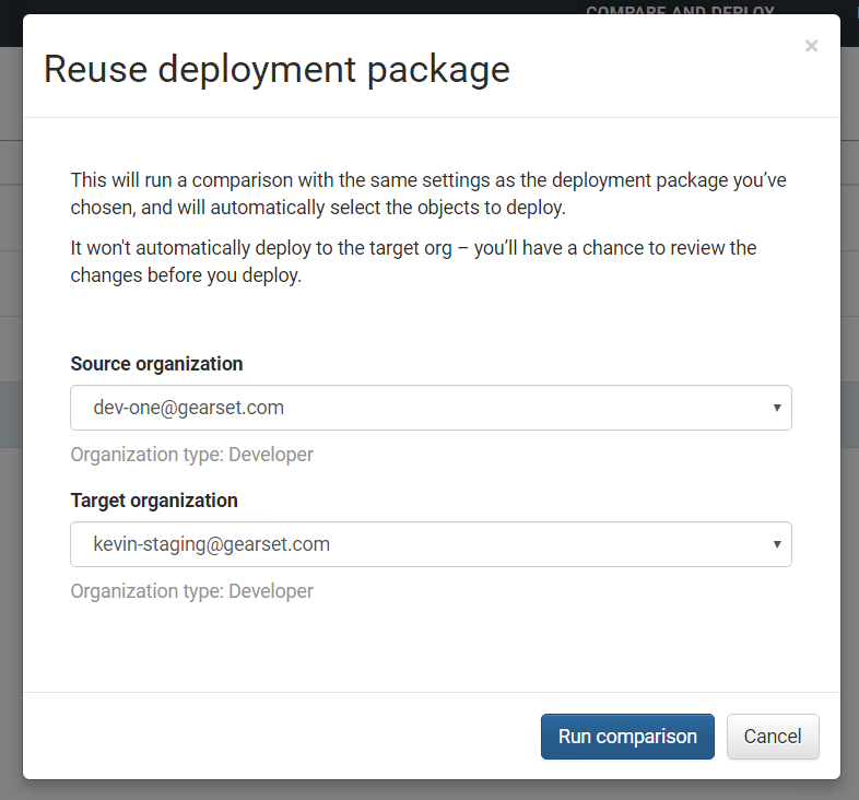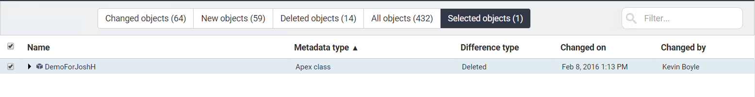 When the comparison is complete, Gearset will automatically select the objects used in the previous deployment.