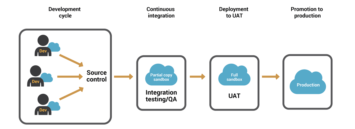 A common strategy in any software project is to have a pipeline of environments.You start with a development environment to make the required changes, which are then promoted to a test environment for QA. Those changes get signed-off by your business users in a UAT environment before finally being deployed to production when all stakeholders are confident in the release.