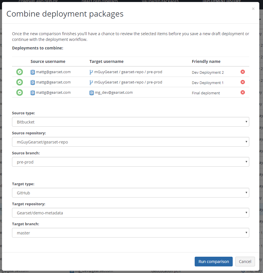 Select the source and target of your new combined deployment package and kick off a fresh comparison to continue. Note that any custom filter and managed package settings from your selected deployments will be automatically combined and applied to your new comparison.