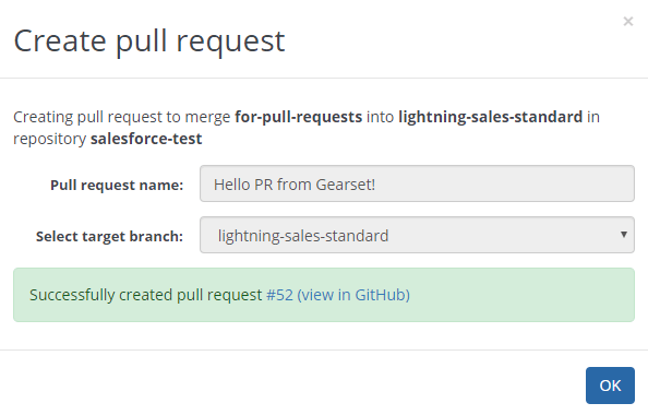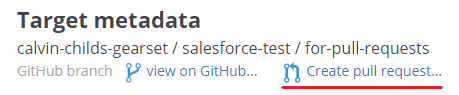 After you’ve successfully deployed to a GitHub branch, you can create a PR via Gearset by clicking Create pull request... on the Deployment Successful page.