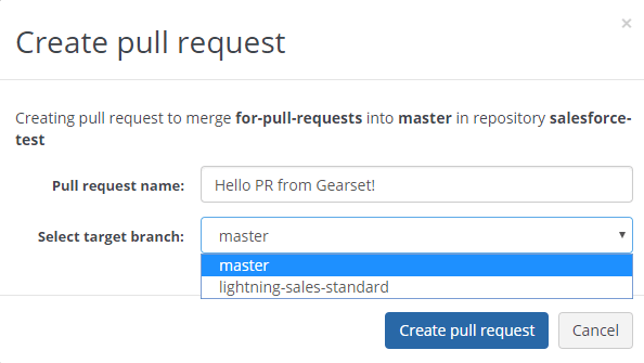 On clicking the link, Gearset will prepare a pull request using the original deployment branch (in the above example this is for-pull-requests). Gearset will fetch the full list of other branches in the repository and ask you which one to use as the target of the pull request. If the repository has a master branch, then Gearset will use this as the default target.