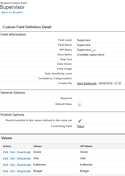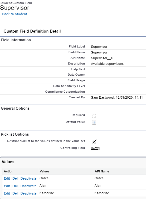 Suppose we have a custom object Student with a picklist field Supervisor. Supervisor is a restricted picklist (i.e. under picklist options, “Restrict picklist to the values defined in the value set” is checked).