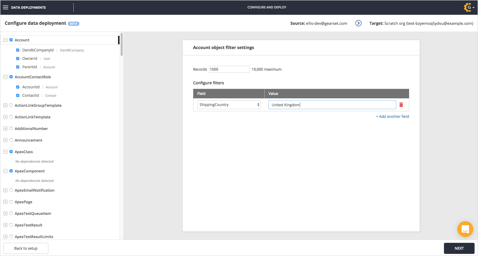 - Use the object filter settings to customise your data set and retrieve and deploy records by field value.
