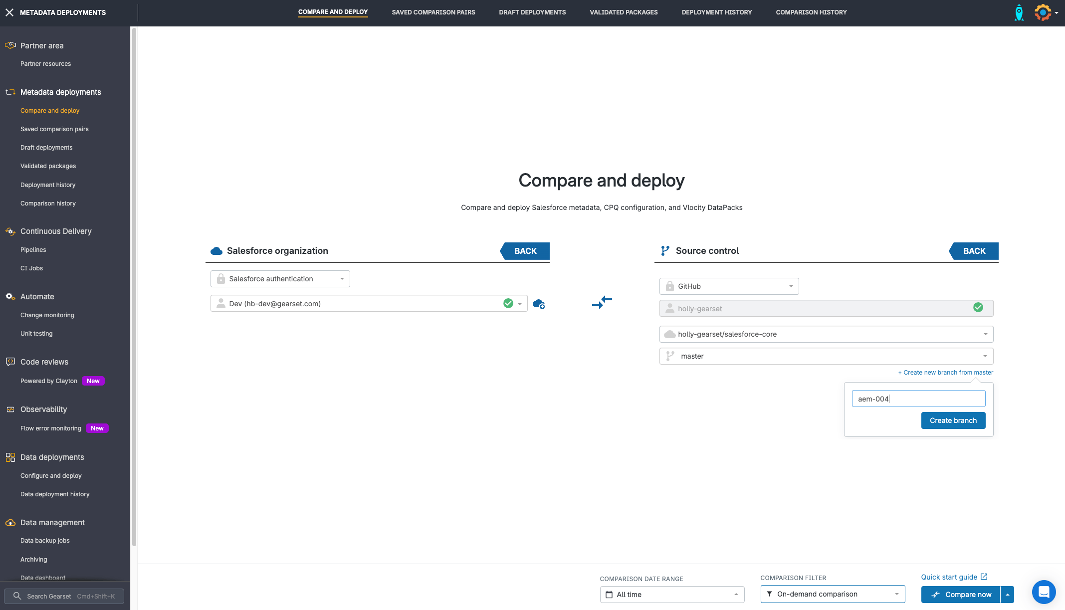 Gearset makes committing to branches and opening PRs entirely declarative, so you can enable all team members to adopt version control and embrace DevSecOps best practices regardless of their experience. In fact, it’s the same workflow as an org-to-org deployment in Gearset, so there’s nothing new to learn.