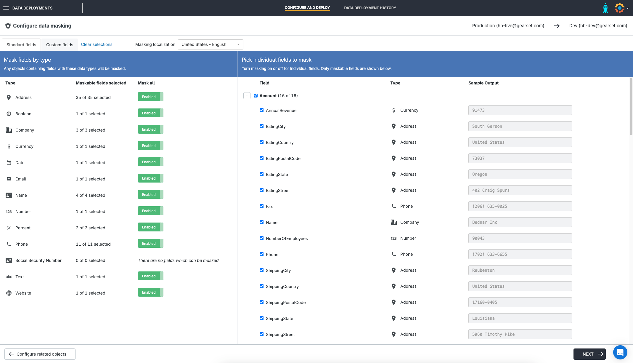Gearset’s data masking lets you use complex and realistic production data safely. During data deployments in Gearset, you can choose to substitute your sensitive records for fictitious records with the same format. This keeps the complexity of the data for testing, but prevents sensitive information getting out of production and into developer orgs.