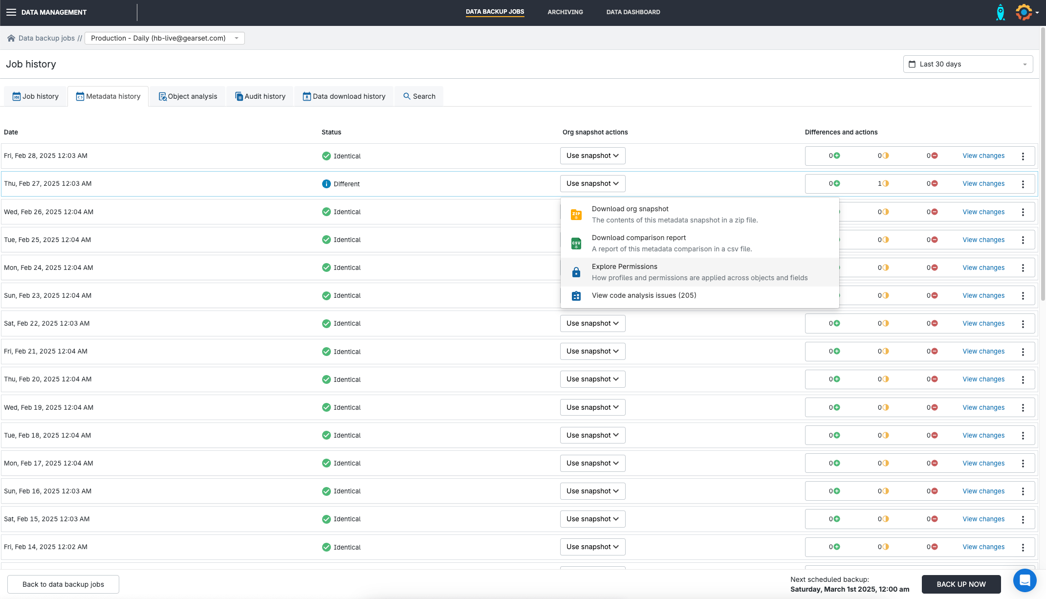 Gearset’s Salesforce backup solution automatically runs daily backups of both data and metadata with customisable notifications for unexpected changes to your orgs data and metadata. Backup data is stored securely, with enterprise-grade encryption in transit and at rest. With a variety of restoration flows, you can confidently restore your data — whatever type of data loss incident you experience.