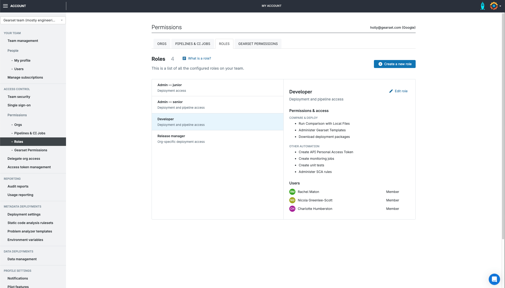 Create and assign roles within the Gearset app, to easily apply the principle of least privilege and define access levels to different areas of app functionality as well as specific orgs, pipelines, and CI jobs. Automatically generate permissions reports for a quick security audit of your permissions structure.