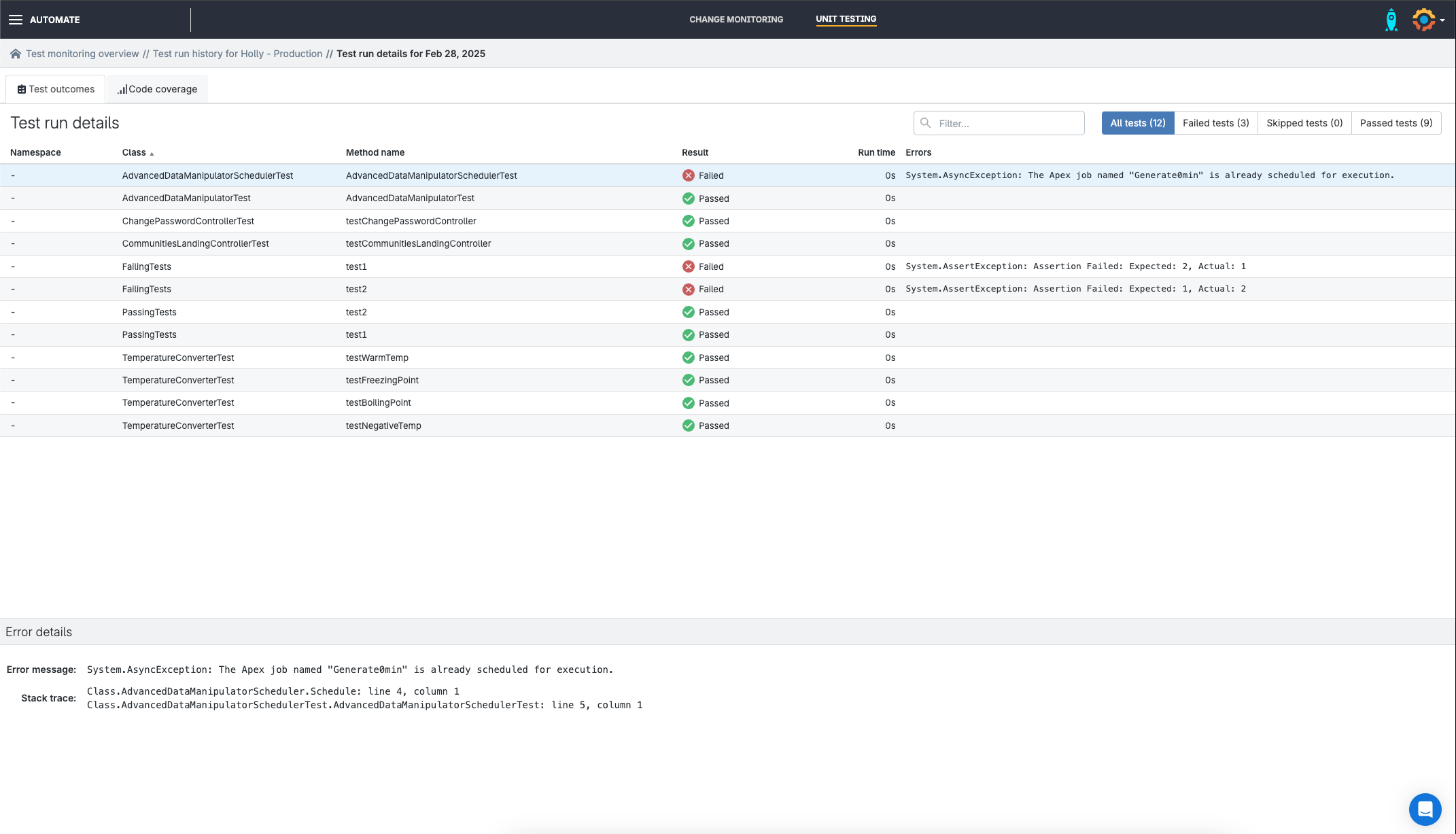 Automated daily unit testing means you can track the code coverage in your org and ensure yours never drops below the required 75% coverage. You’ll be notified if coverage drops below your specified threshold with an overview of which tests are failing with a stack trace for easy identification of issues. This proactive approach to code coverage not only boosts code quality but also enhances observability by providing a reliable way to track the security and reliability of your codebase over time.