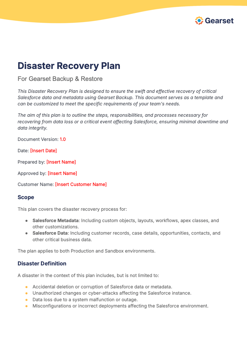 Whatever your plan for backing up your critical Salesforce data, it’s important to document key activities and considerations associated with recovering from a data loss. Your disaster recovery plan should include a definition of what you would class as a ‘disaster’, objectives for recovery (how fast and how far back do we go), who’s responsible for key tasks, and a checklist of the actual steps your team will need to take.