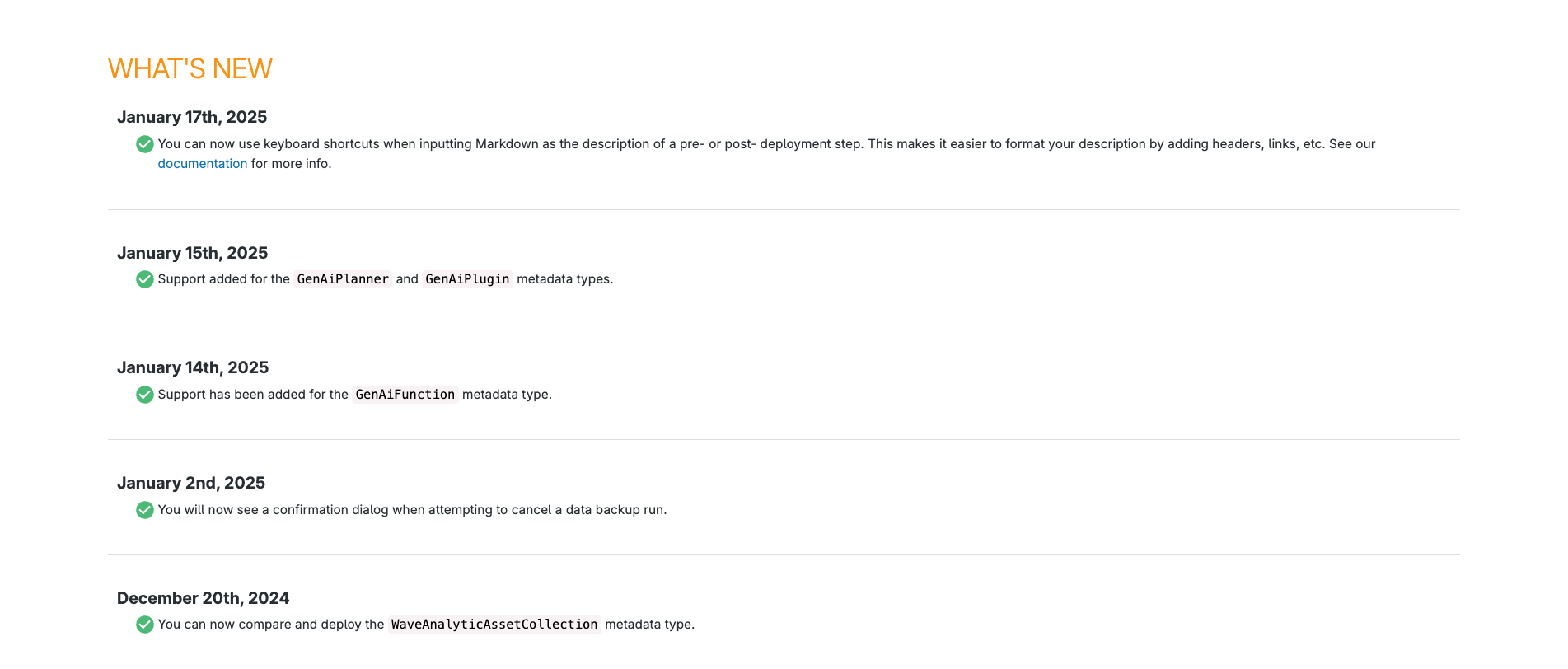A checklist may form part of your environment or branching strategy documentation, or it might be a standalone document, and usually details the key aspects of newly released features. These may include: