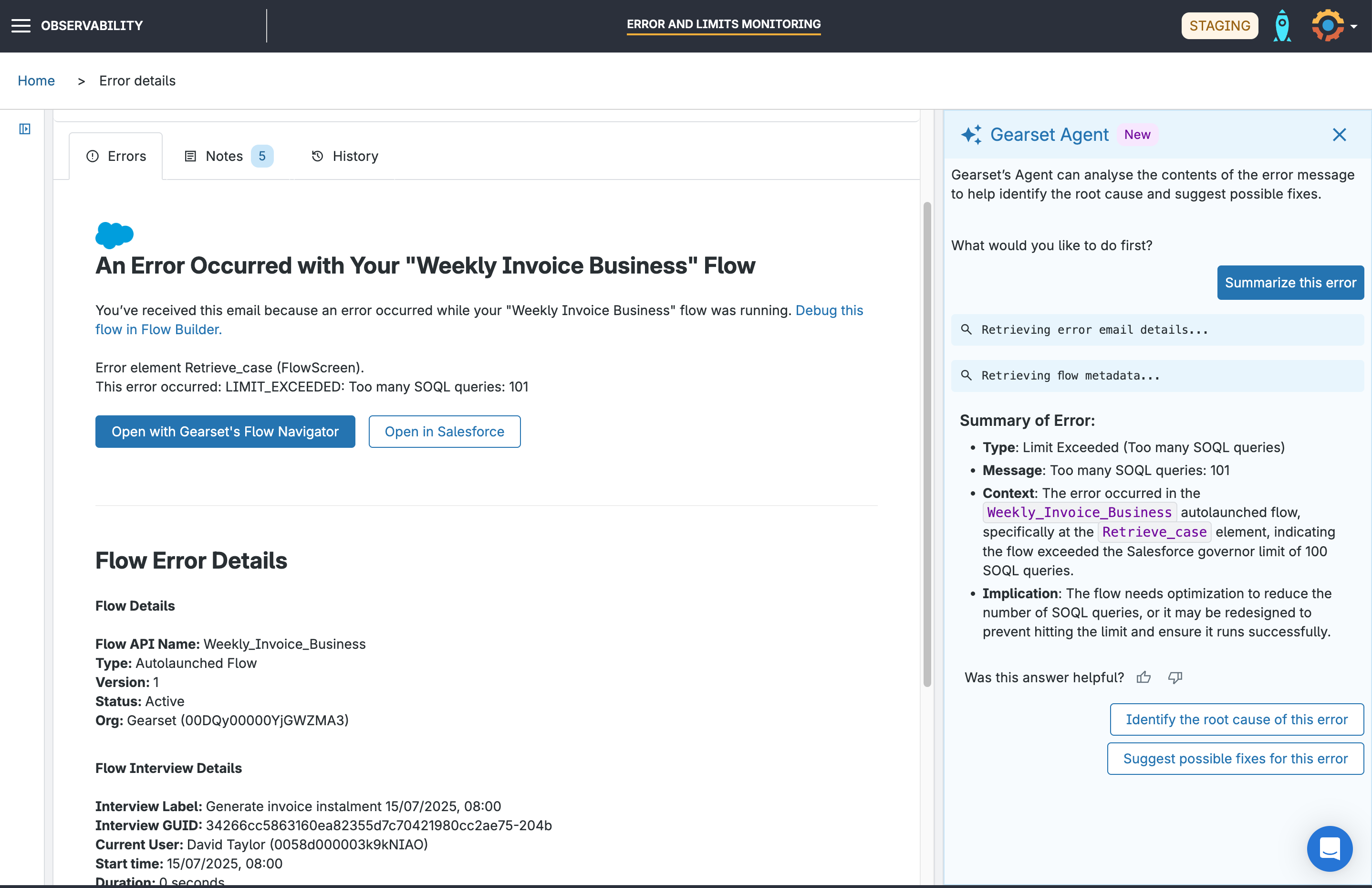 Gearset’s Observability solution brings best practices to Salesforce teams, without the need for specialist setup or ongoing maintenance. It gives you enhanced visibility, insights and context to any issues encountered, helping you plan better, respond faster, and improve platform stability and business outcomes. And when combined with Gearset’s Agent, you can also leverage that insight to give actionable solutions to Flow errors at speed.