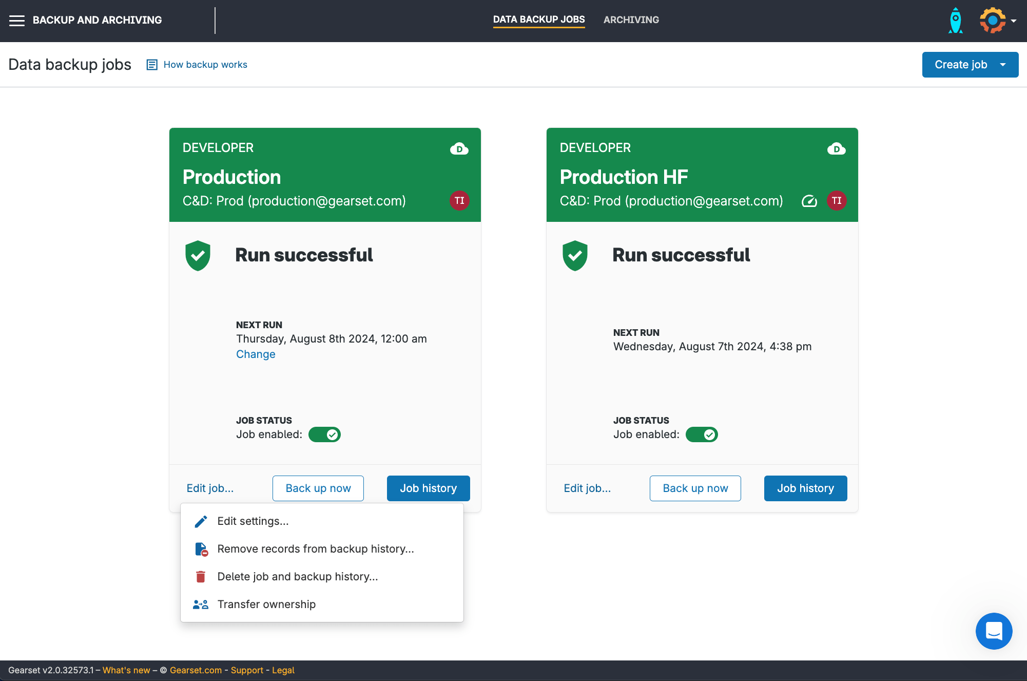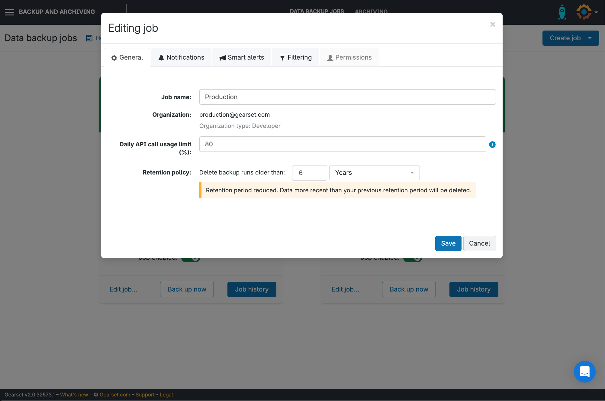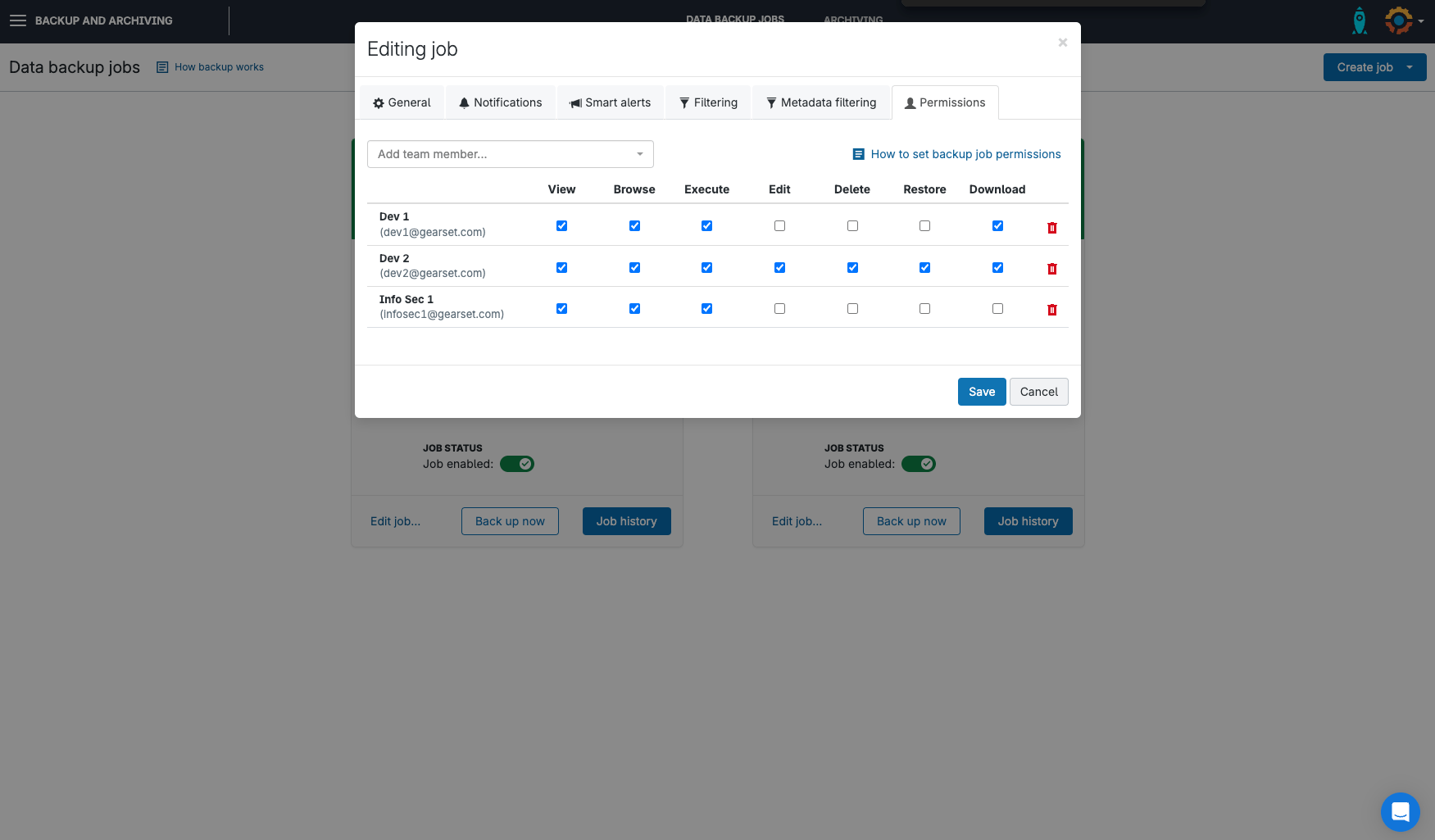 Configure custom backup access for members of your Gearset team, to make sure no one has unnecessary access to your customer data. If you want to review and change user access down the road, go to Edit job > Edit settings > Permissions to quickly view and edit permissions for your backup job.