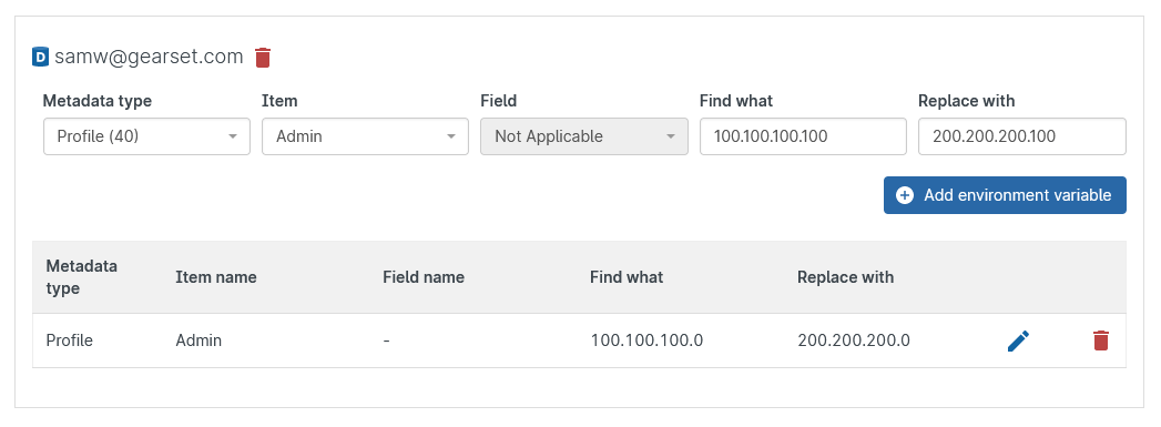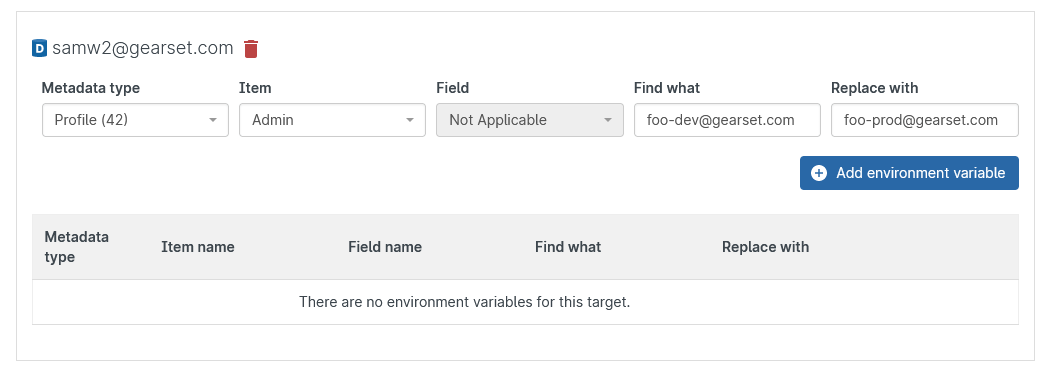 As you can see in the image below, each target connection has a table of environment variables that will be applied to deployments featuring the specified metadata type and item. Gearset looks for instances of the ‘Find what’ value and changes it to the ‘Replace with’ value. Note that this functionality can’t be used to edit XML tags, only the values within them.
