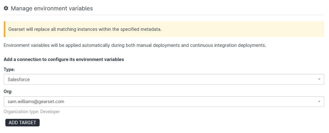 To configure environment variables, head to the My Account page in Gearset and select the Environment variables tab. Then choose a target connection to create variables for and hit Add Target. All target types can have environment variables, including Git-based providers. At this point, no replacements are being made in the target. The next stage is to set up individual values to find and replace during deployments.