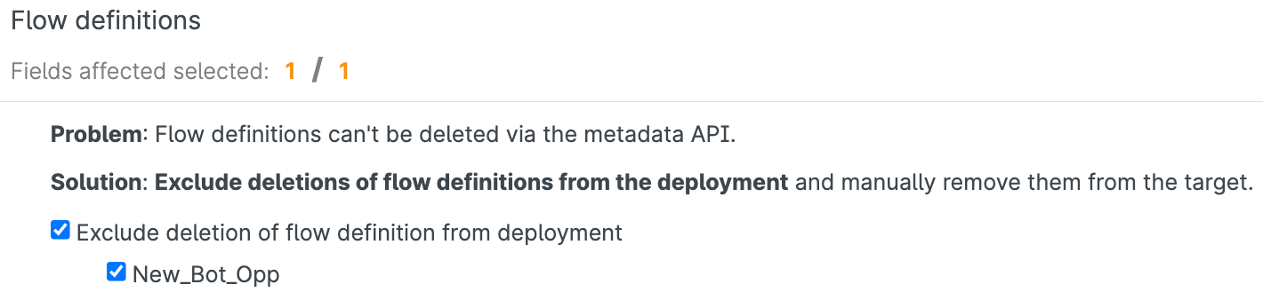 Because deploying Flow Definitions on v44 or higher of the Metadata API can be problematic, one of Gearset’s problem analyzers will automatically warn you about a deployment package that does this. You can decide whether or not to remove the Flow Definition.