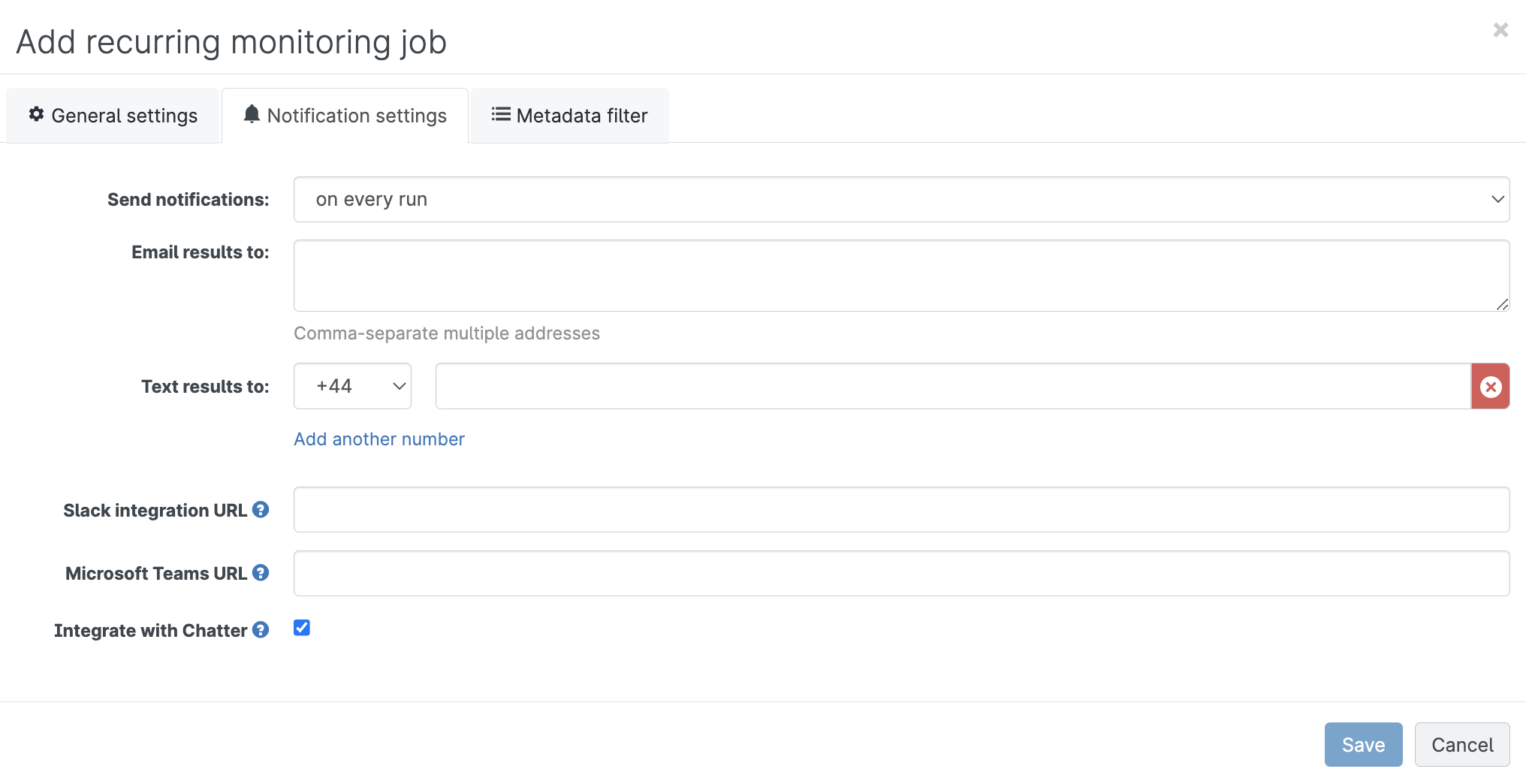 Gearset screenshot: Monitoring job page showing integrations with chat tools like Slack