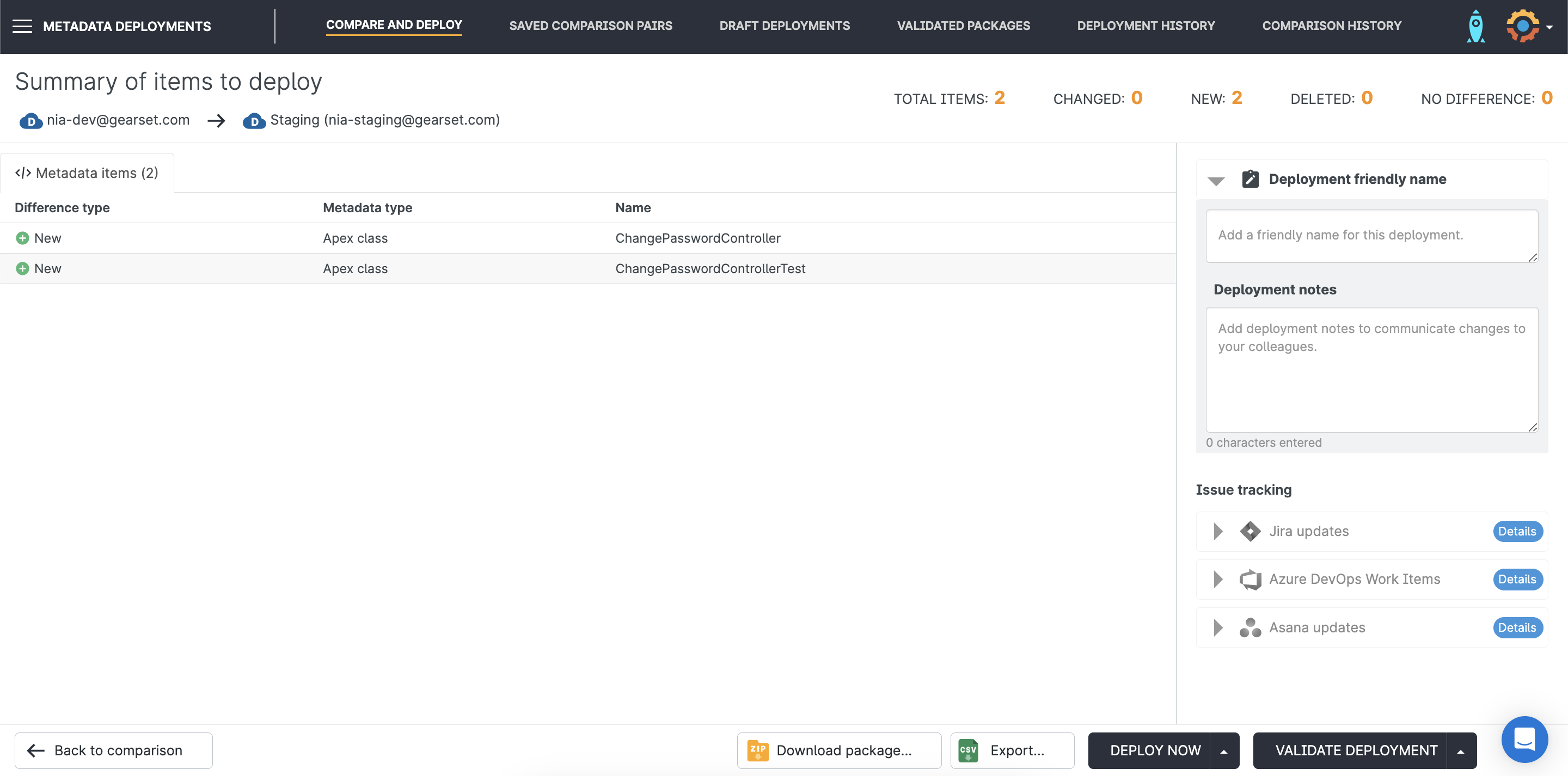 For Jira integration, Gearset automatically posts updates to Jira tickets when you run validations and deployments. This allows you to track the status of your user stories and support tickets more quickly so you can efficiently make necessary changes — speeding up your release cycles.