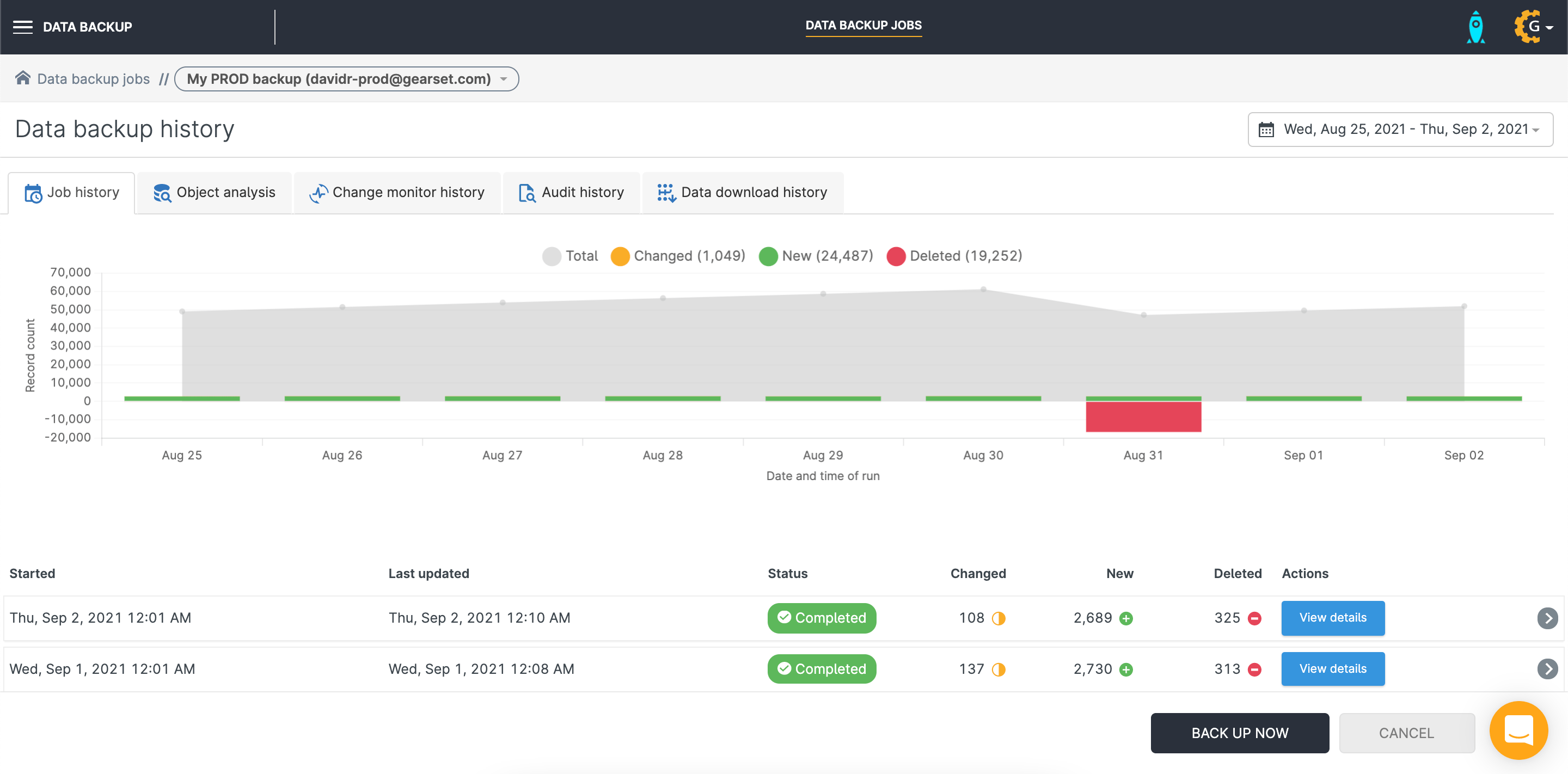 - Delete: delete individual records or the entire backup job and its history