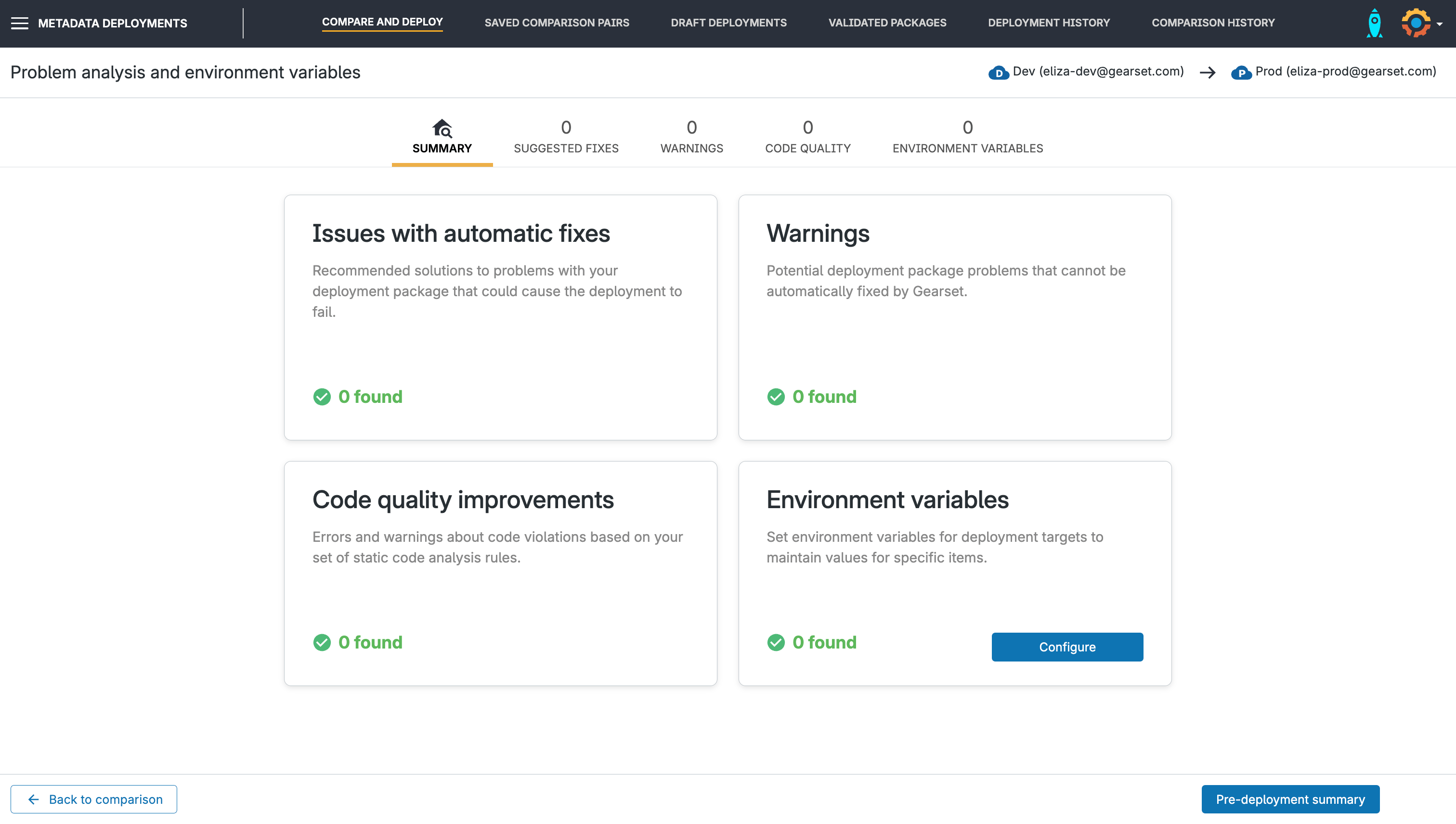 If any issues are detected, Gearset will suggest a fix for you to make yourself or you can opt for it to be made automatically. Once you’re happy with the analysis results, hit Pre-deployment summary.