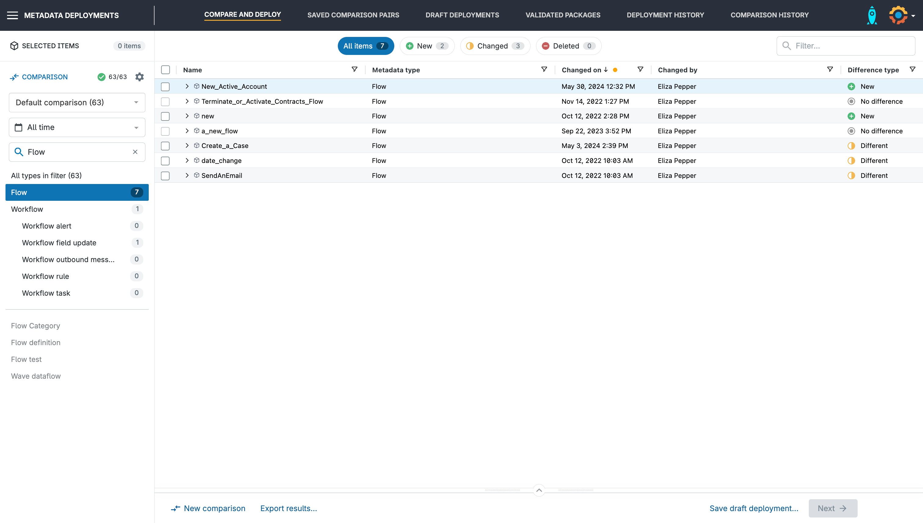 Using the left hand menu, select the metadata filter for your comparison. This will help speed up your comparison process by only looking at relevant metadata. You can set up custom filters and specify which metadata types you’d like to compare, but Gearset’s default comparison includes the most frequently updated metadata types — and includes Flows!