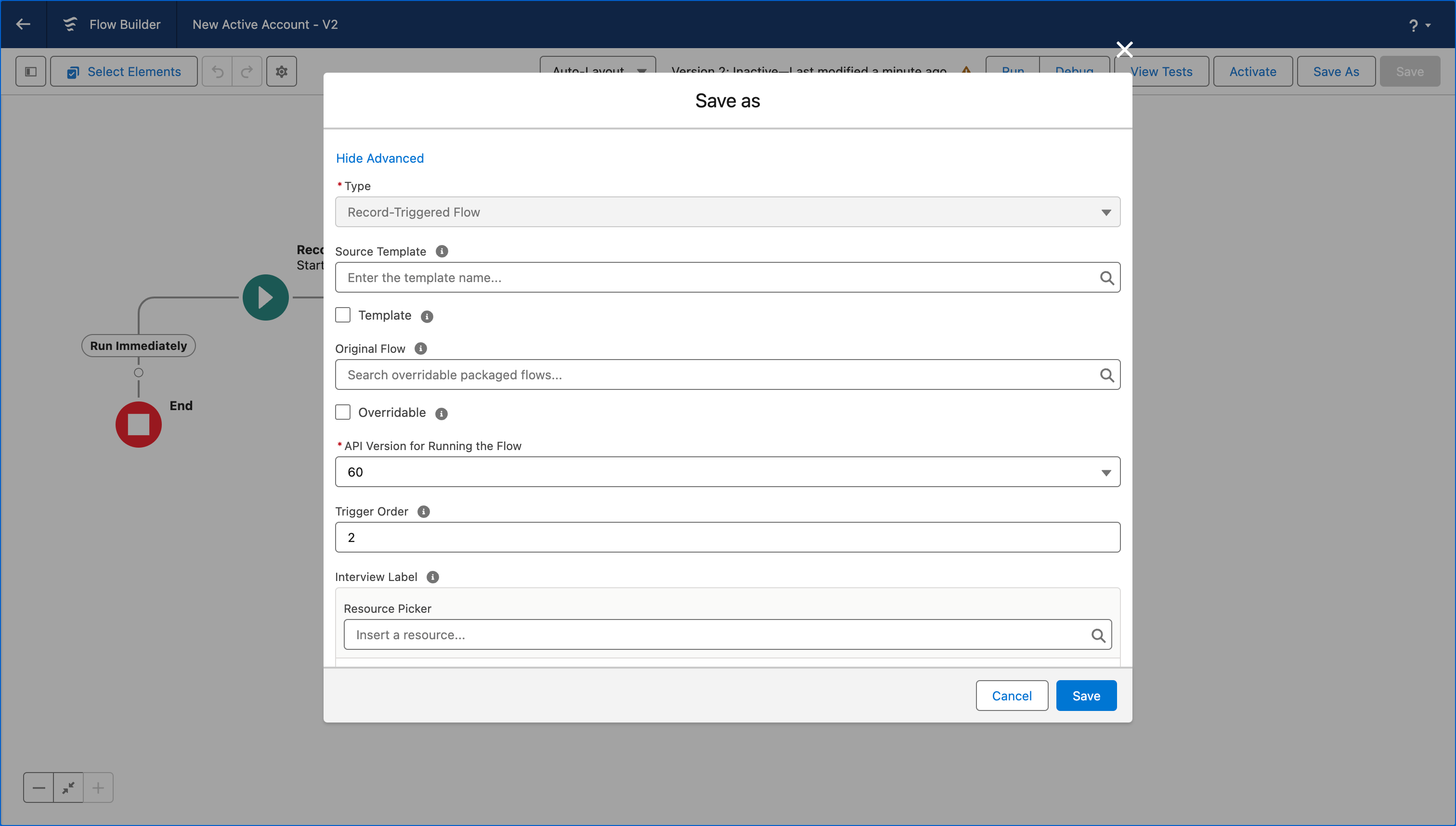 You can also click Show Advanced to make changes such as altering the “API Version for Running the Flow” or setting the “Trigger Order” for this Flow to run if you have other Triggered Flows running for this Object.