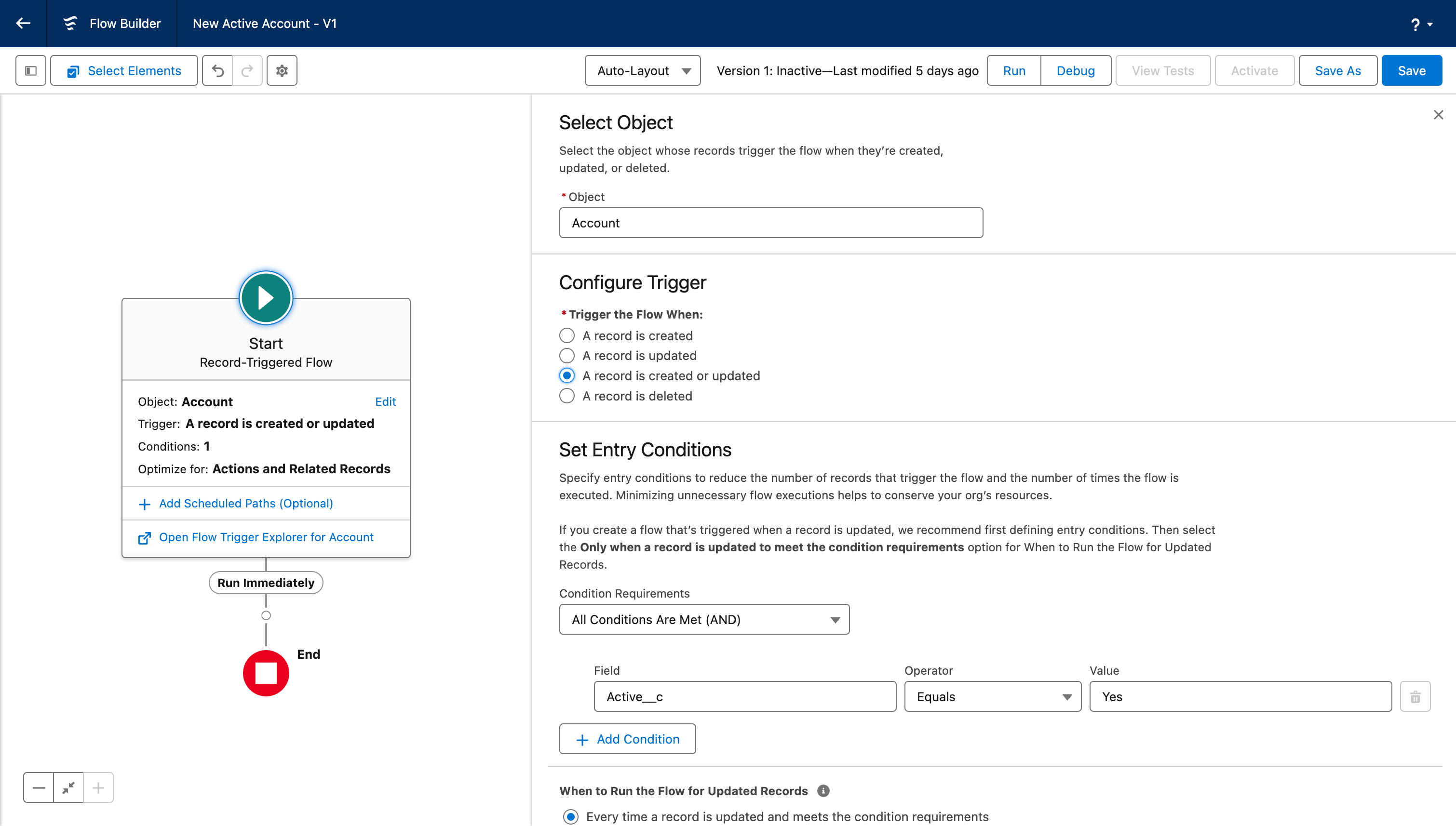For example, let’s say you want to set up a Flow that sends an email to your customer support team each time a new active account is created. Start off by selecting the Account Object. Then, under the Configure Trigger section, set the Flow to run each time “A record is created or updated”.