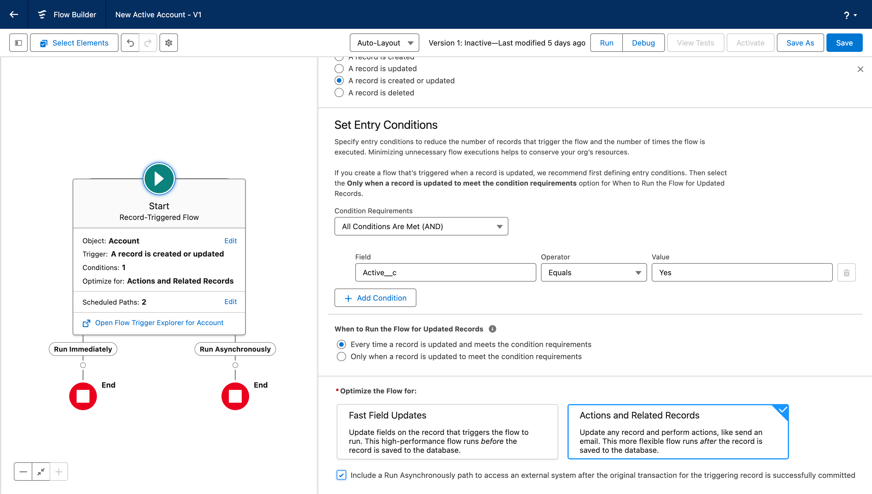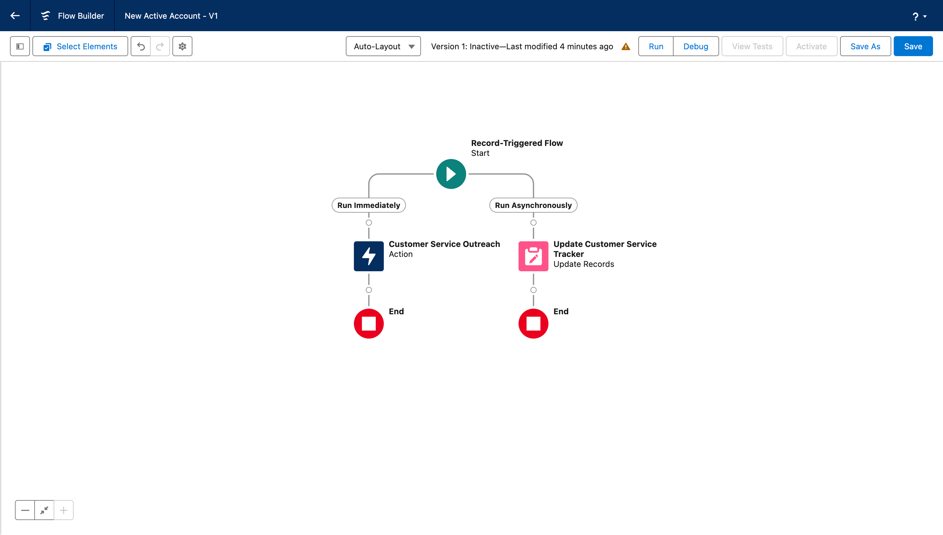 In this example, you might want the Action that triggers customer service onboarding work to run immediately when a new active account is created, but for updates to the Customer Service Tracker, which could take a long time, to run in an asynchronous path that executes in the background.