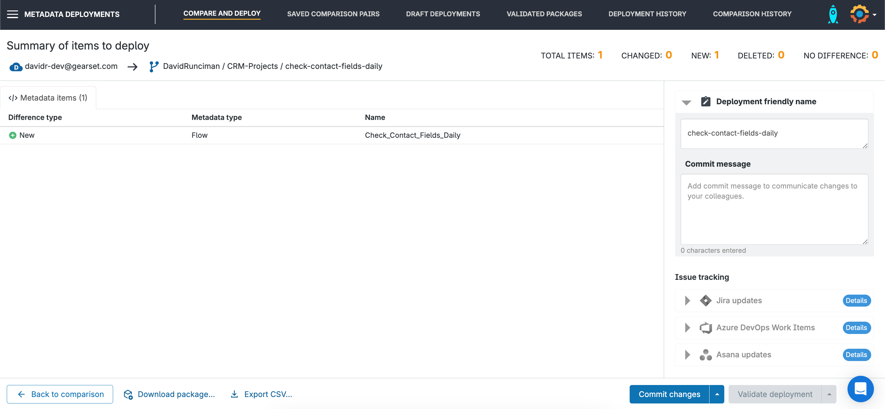 We’ll name the deployment so our team has the context when they’re browsing the deployment history. We can update a ticket in whichever tracking tool we’re using, and then click Commit changes.