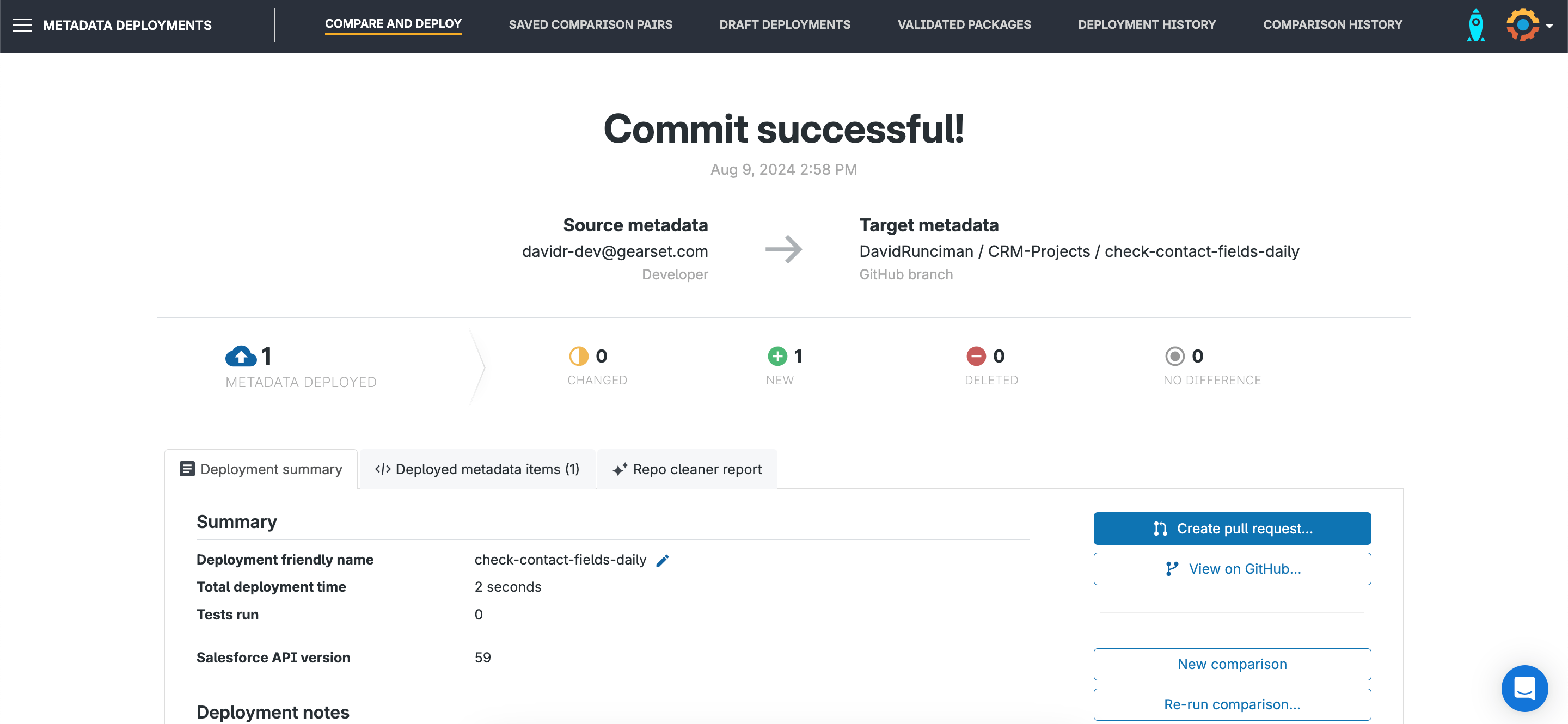Gearset will flag any issues with a deployment, such as a missing dependency that will cause the deployment to fail. This deployment looks fine, so we can go ahead and click Pre-deployment summary.