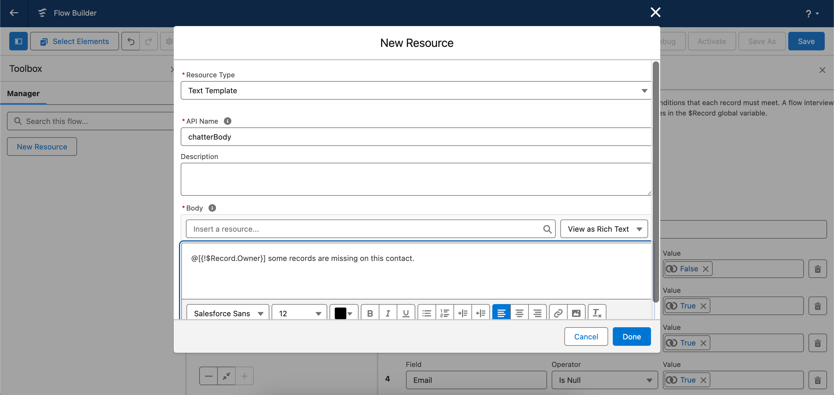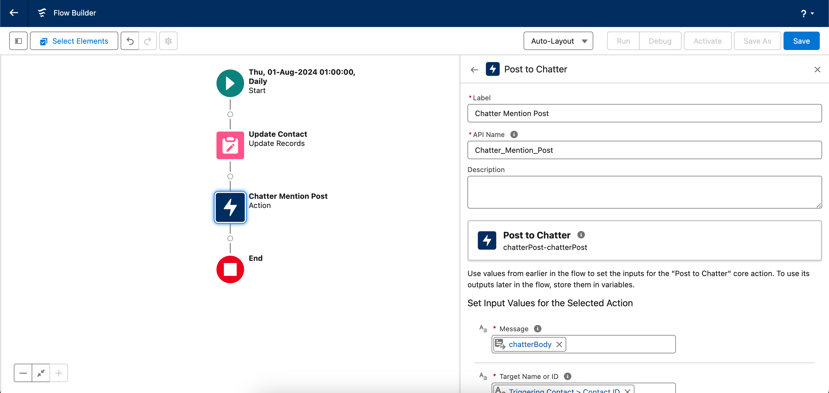 Finally, create an Action element that will post a message to the contact owner via Chatter.