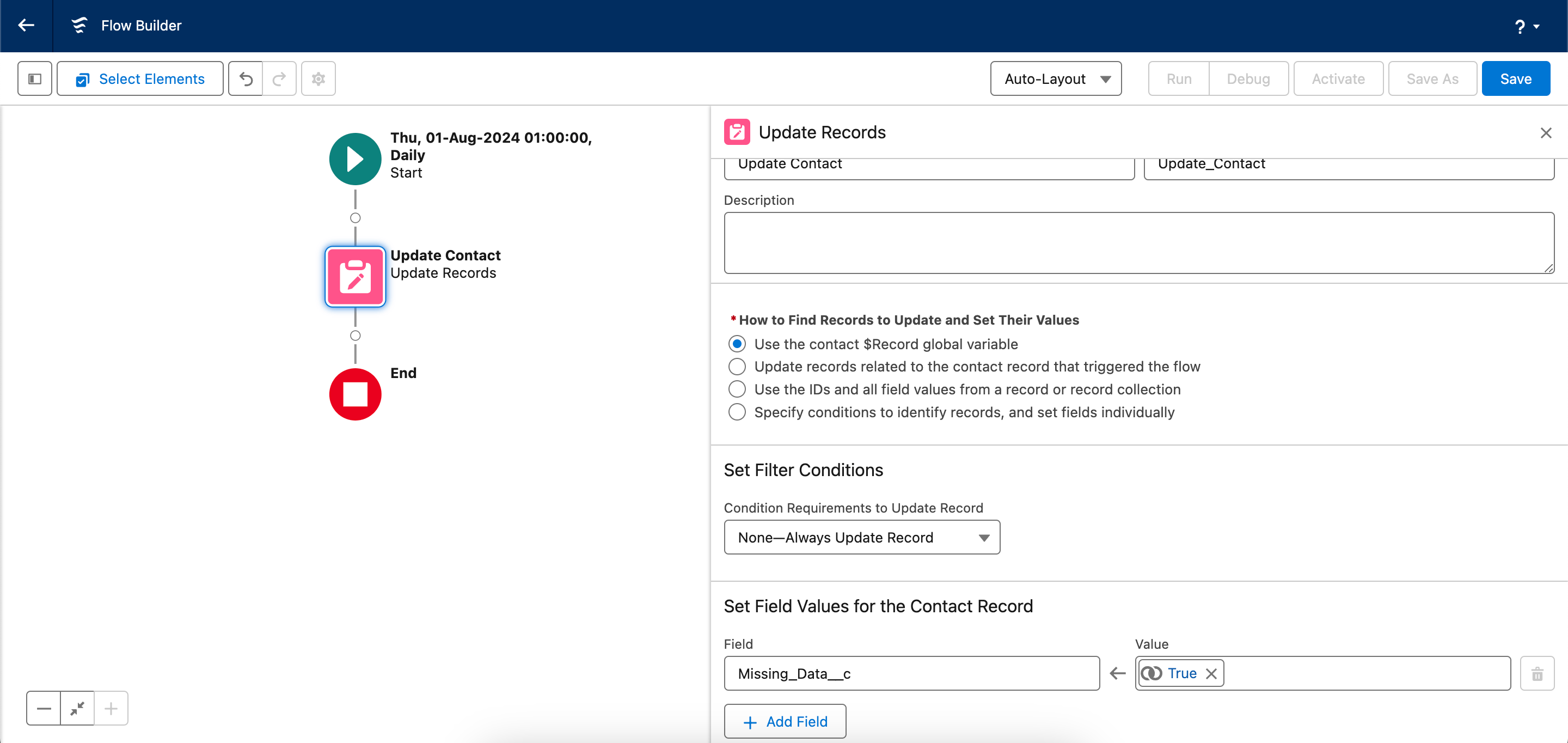 Let’s build a schedule-triggered flow and explore options for deploying it between two environments. The example we’re using comes from Trailhead’s module on schedule-triggered flows. We’re creating a flow that runs daily, checking for missing contact records and alerting contact owners of data gaps.