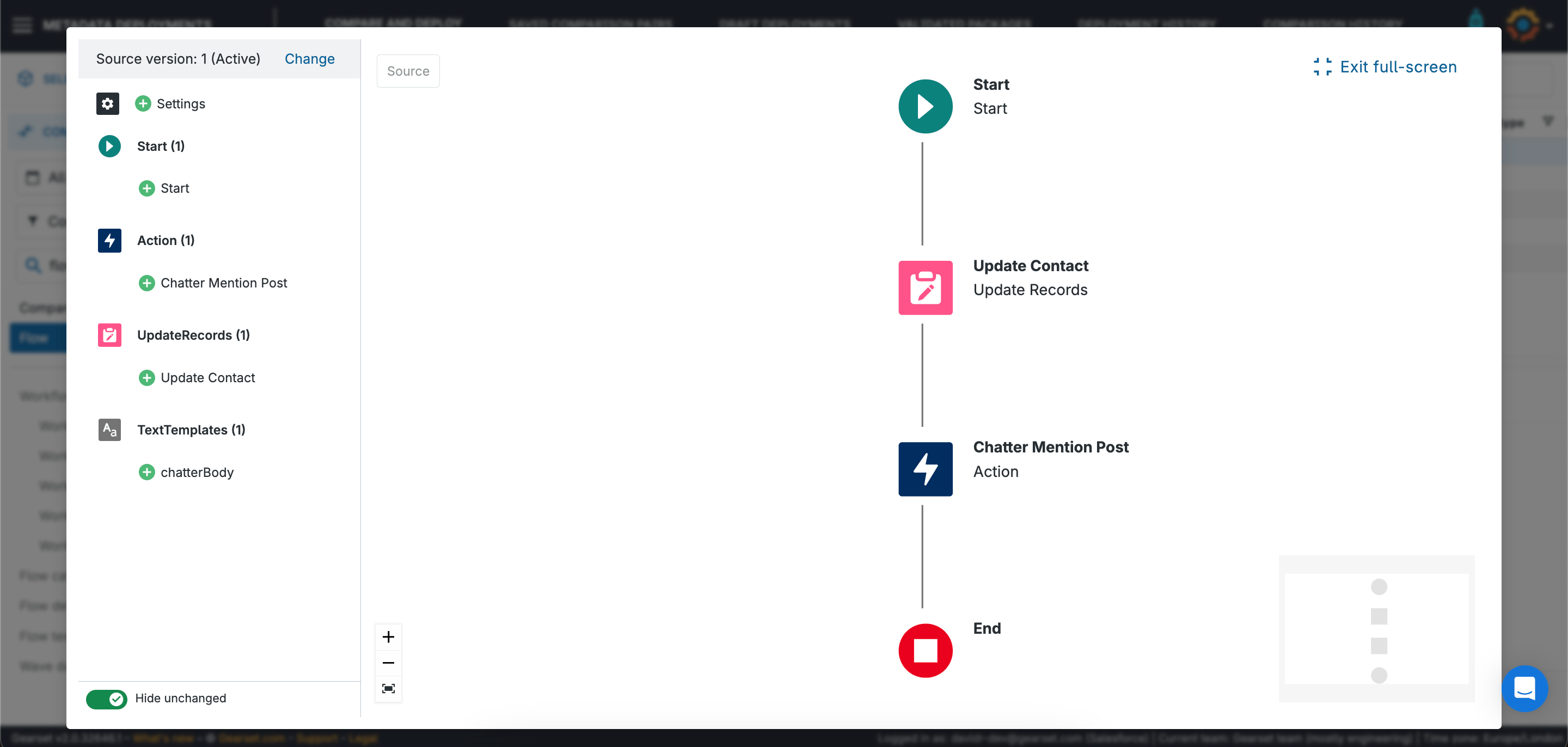 When we select a flow in the comparison results, Gearset will show us what that flow looks like — just as it looks in Flow Builder. We can see any elements that are different between source and target, and we can select different versions of the flow to deploy.