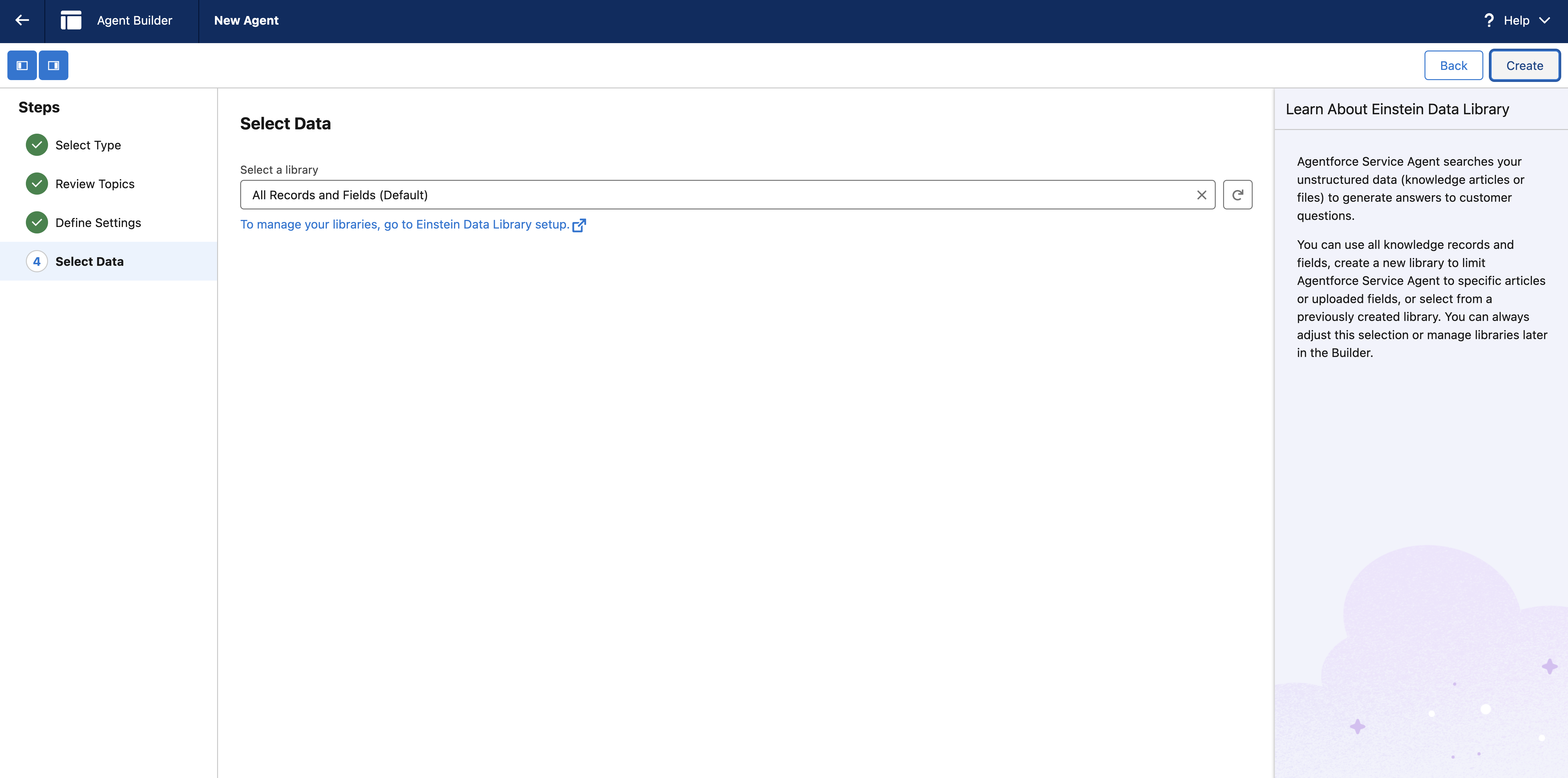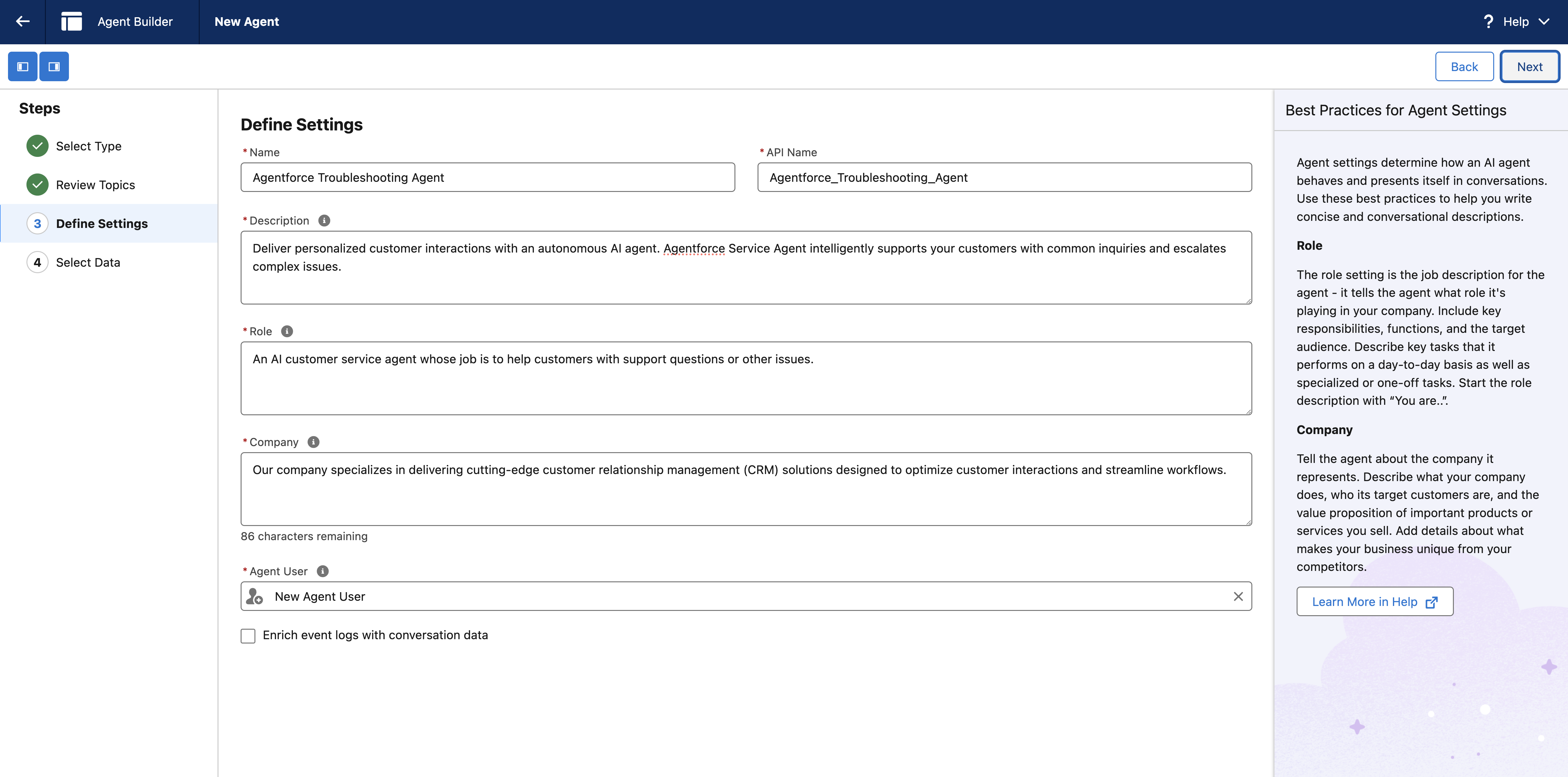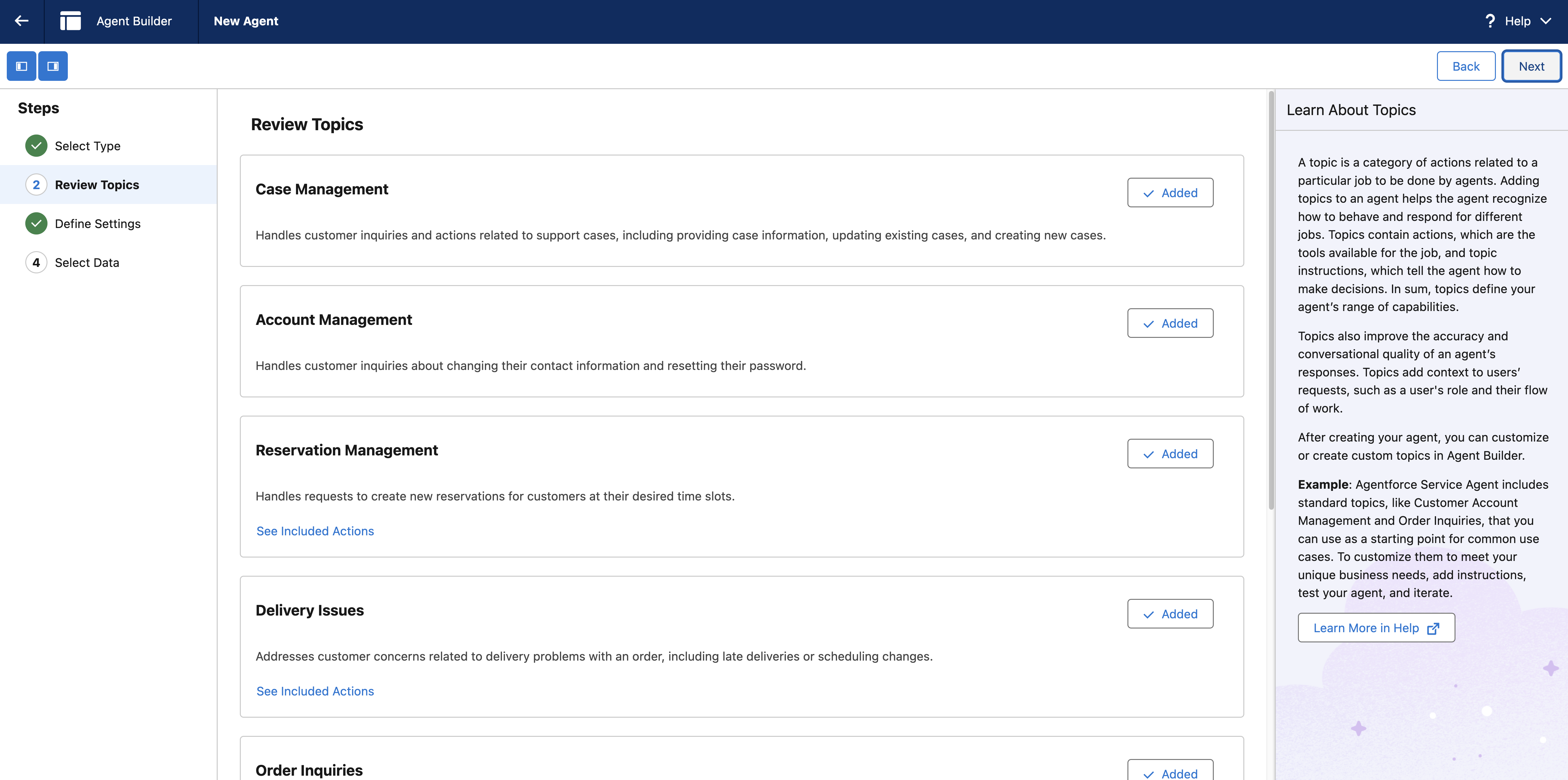 Before you start, it’s important to build your Agent in a sandbox first, test it, and then deploy it to your production org. There are many different settings available to finetune your agents, but the high level steps are similar for any agent creation.