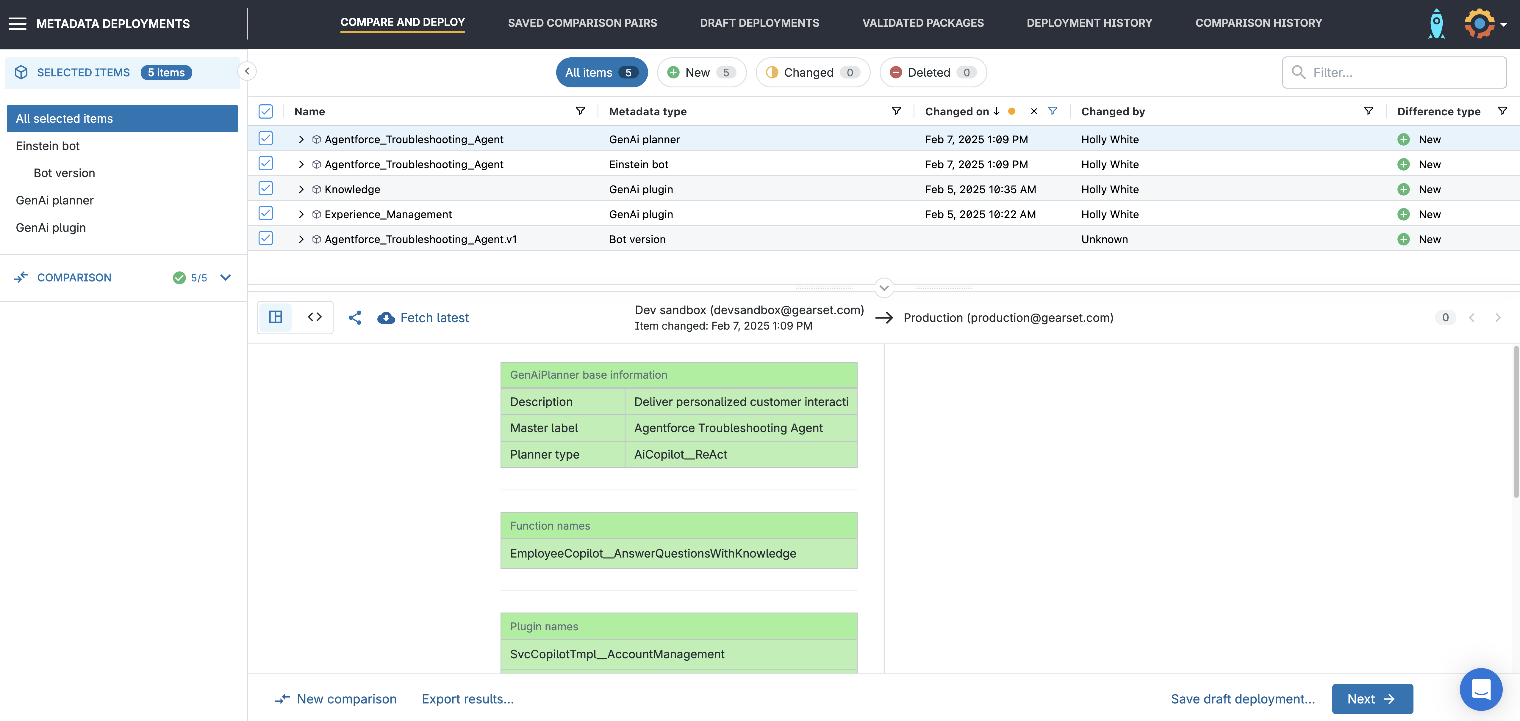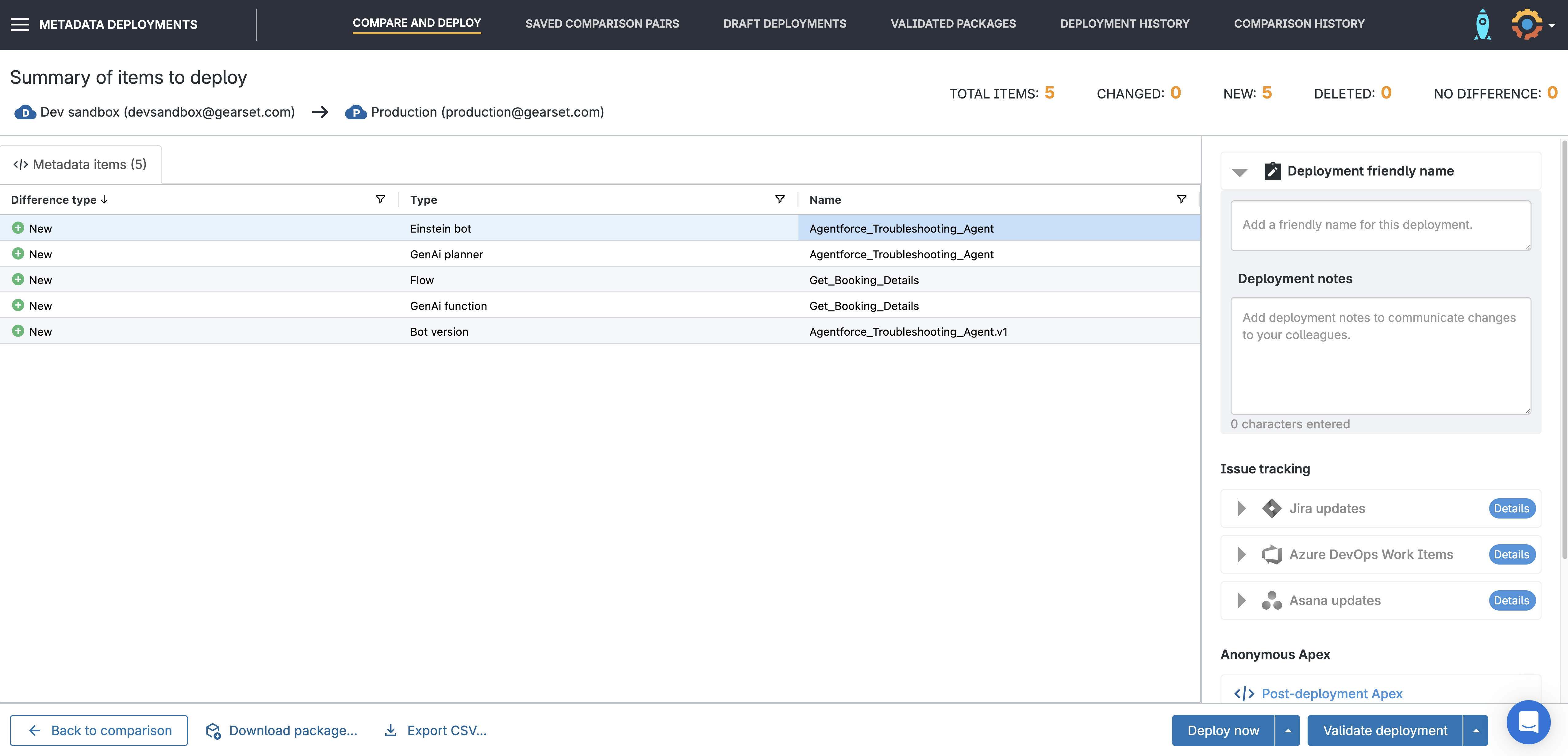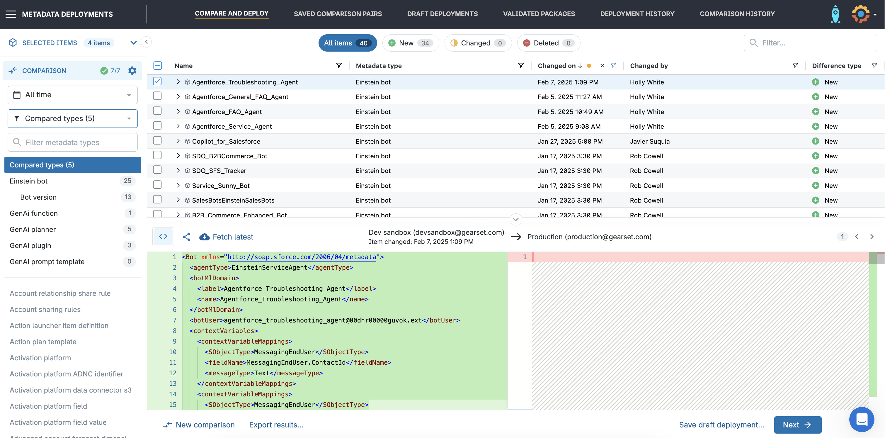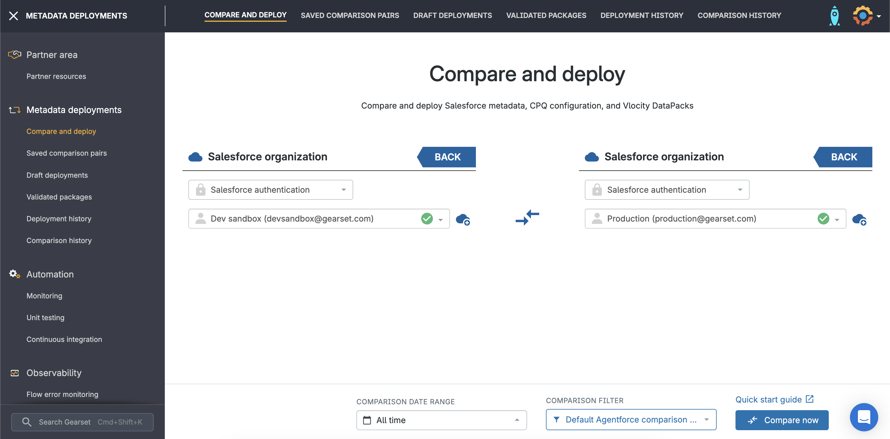 Select your source and target and click Compare now. You can select the default Agentforce comparison filter or select your metadata on demand.