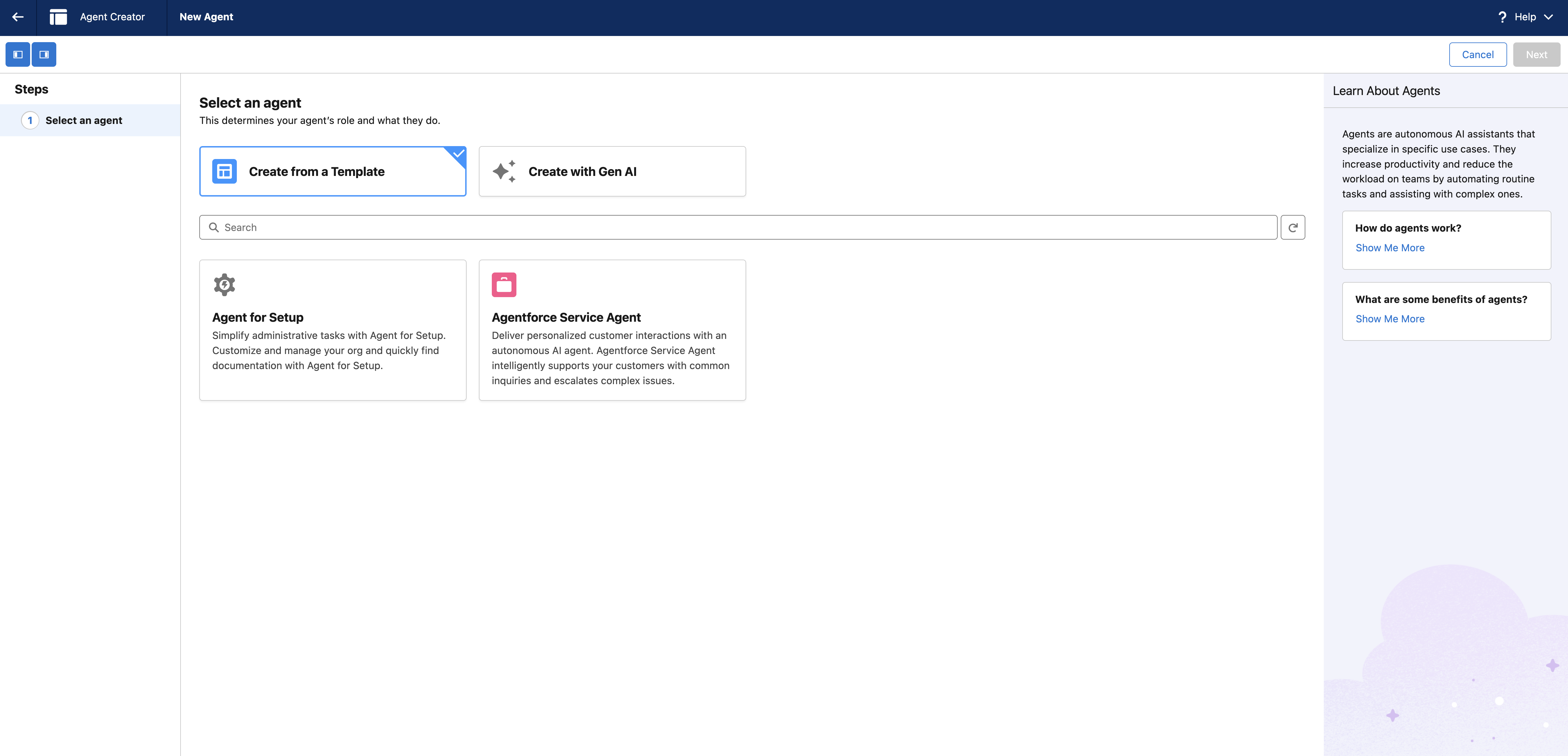 From Setup navigate to Agentforce Agents. Click New Agent and then choose the type of agent you want to create, for example, Service Agent. You can create an agent from a template or create one with Gen AI.