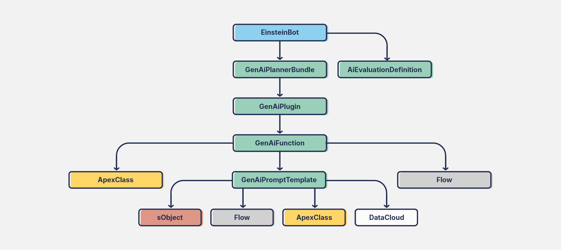- GenAi PlannerBundle (Agent): Defines an AI agent’s reasoning strategy, breaking tasks into subtasks and determining the best actions to execute.