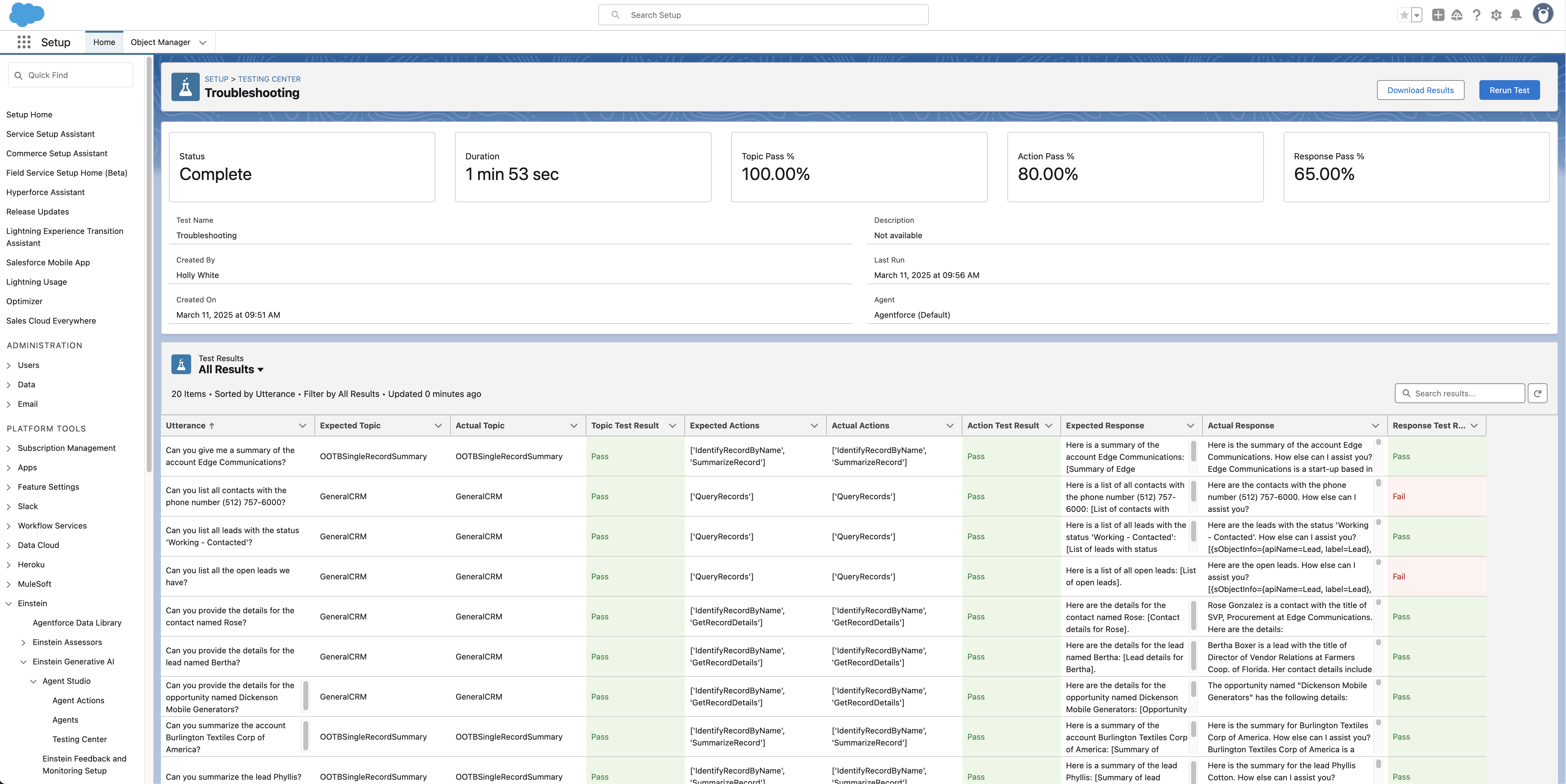 To test your agent at scale, click Batch Test. This will open the Agentforce Testing Center. Name your test, and then either upload your test cases as a .csv or click Generate Test Cases to have Salesforce provide the tests for you. Click Save & Run. Once your cases are generated, click Run Tests (you might need to refresh your browser a couple of times in the process).