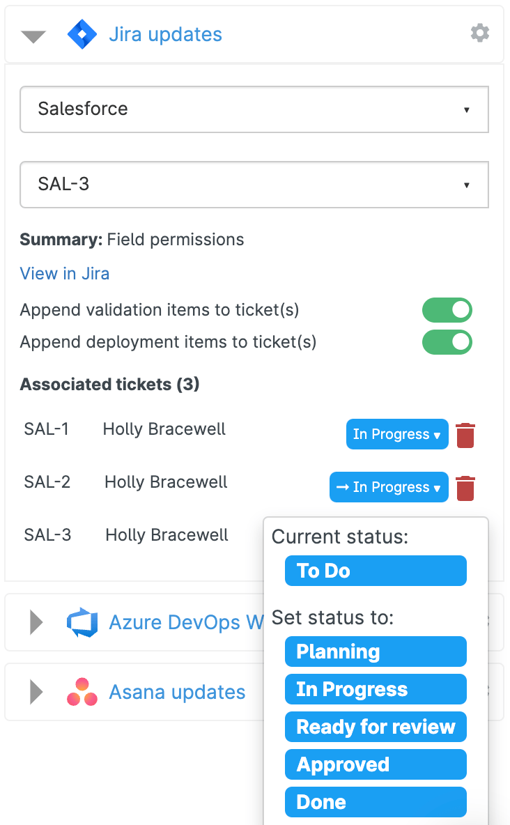 Gearset lets you integrate your issue tracking or project management software with support for Jira, Asana and Azure DevOps, alongside other team collaboration and notification tools like MS Teams, Slack and Chatter. When work gets deployed from one environment to the next, you can update tickets and work items in your project management tool directly from Gearset’s UI.