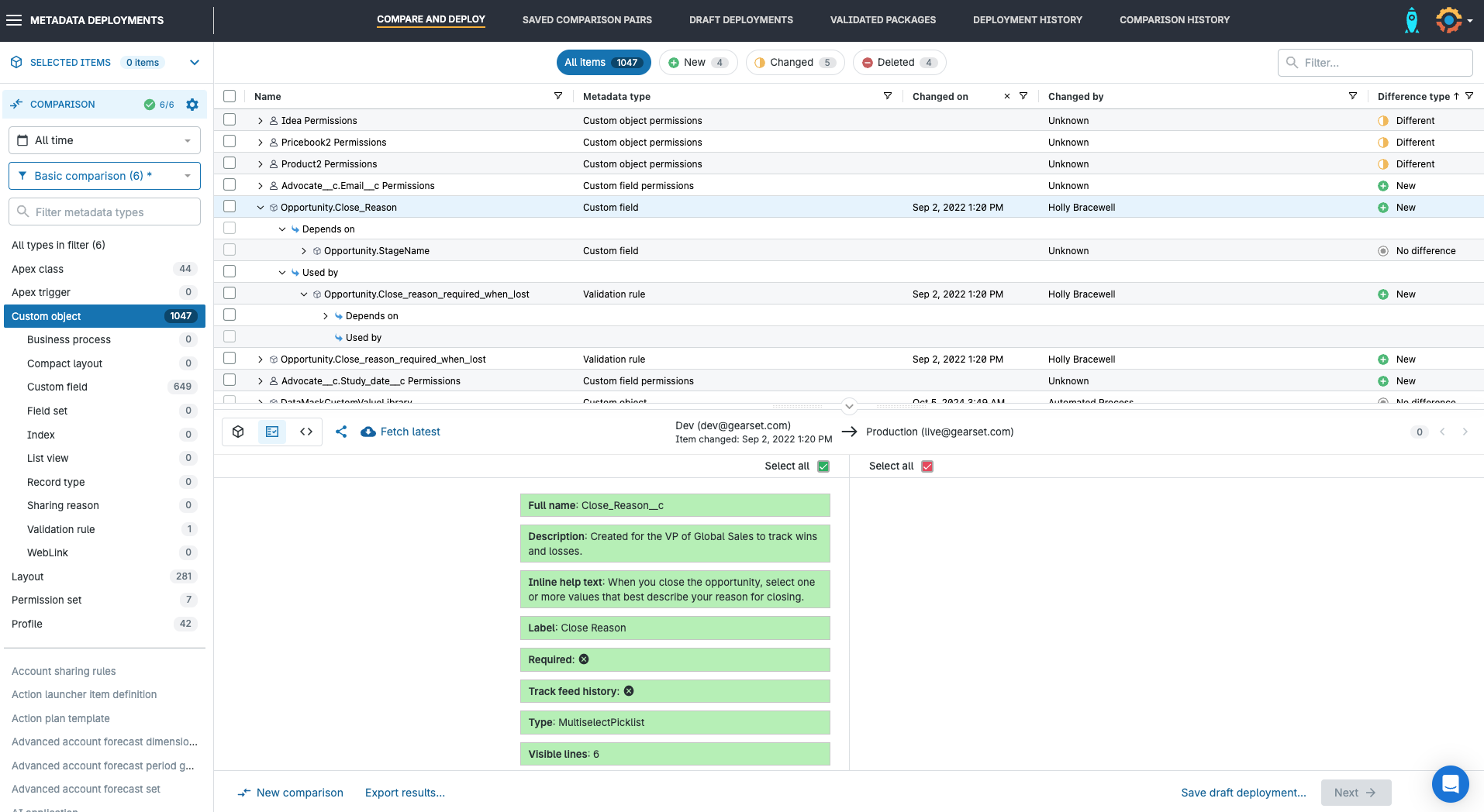 Gearset’s change monitoring gives you the option to monitor changes across any of your orgs and will give you automated alerts when changes are made. This early warning means you can revert the change or propagate it back through the pipeline before any issues arise; this helps teams avoid overwriting each other’s hotfixes with the next release, and gives everyone shared insight into the state of their orgs.