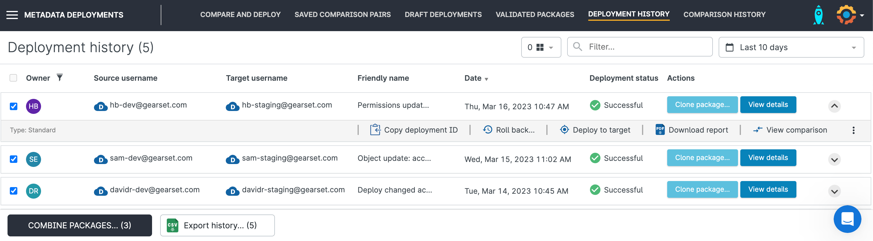 Information on every package deployed using Gearset is kept in the deployment history. You can then use the deployment history page to clone, combine or re-deploy that same package to other environments in your workflow:
