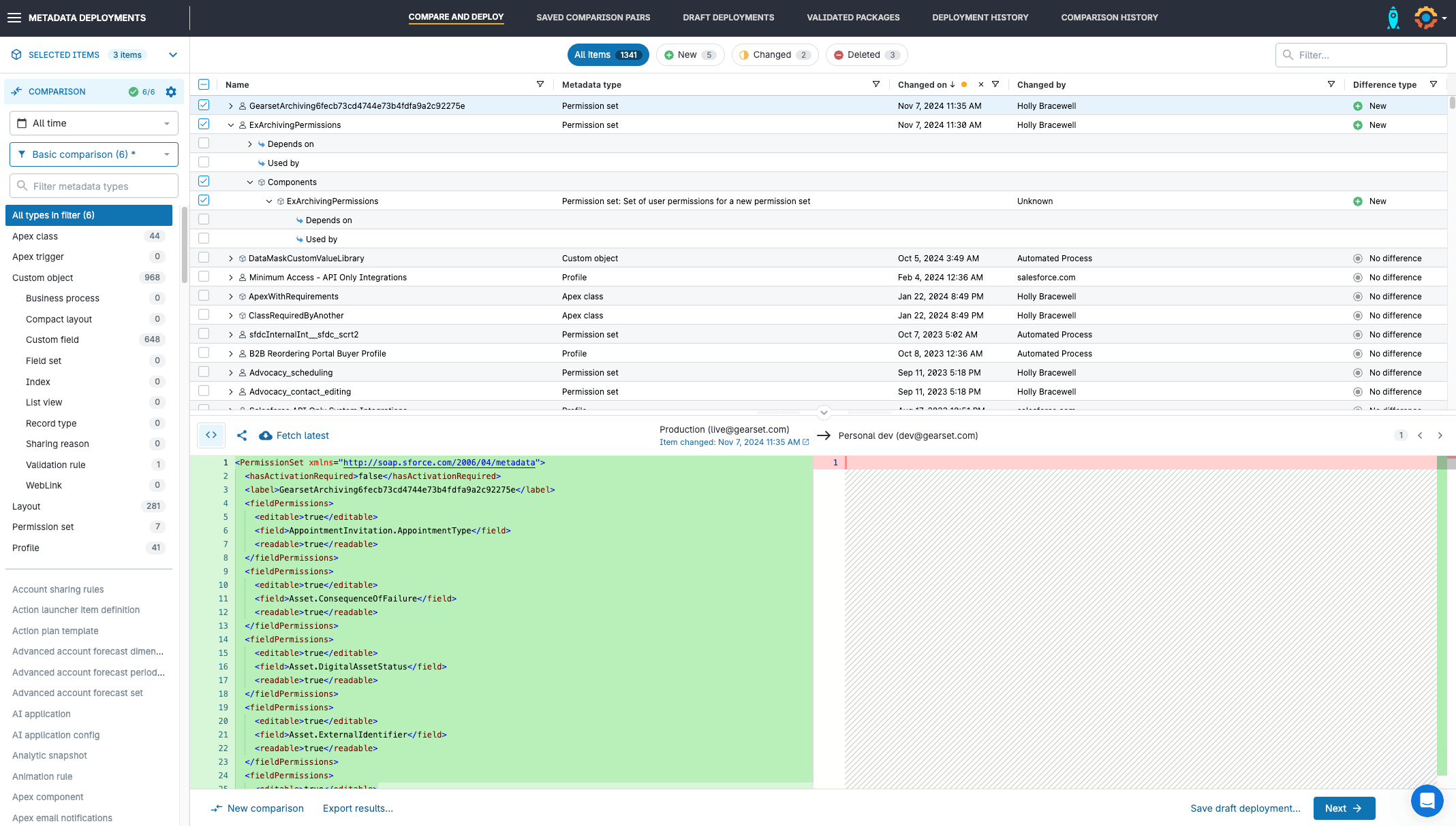 If your team has been following the right development process, the source of truth should have the ‘correct’ version of this metadata, but be sure to check that there isn’t any development work in the lower environment that hasn’t been deployed yet. Gearset’s filters in the Changed on column will help you identify the most recent work.