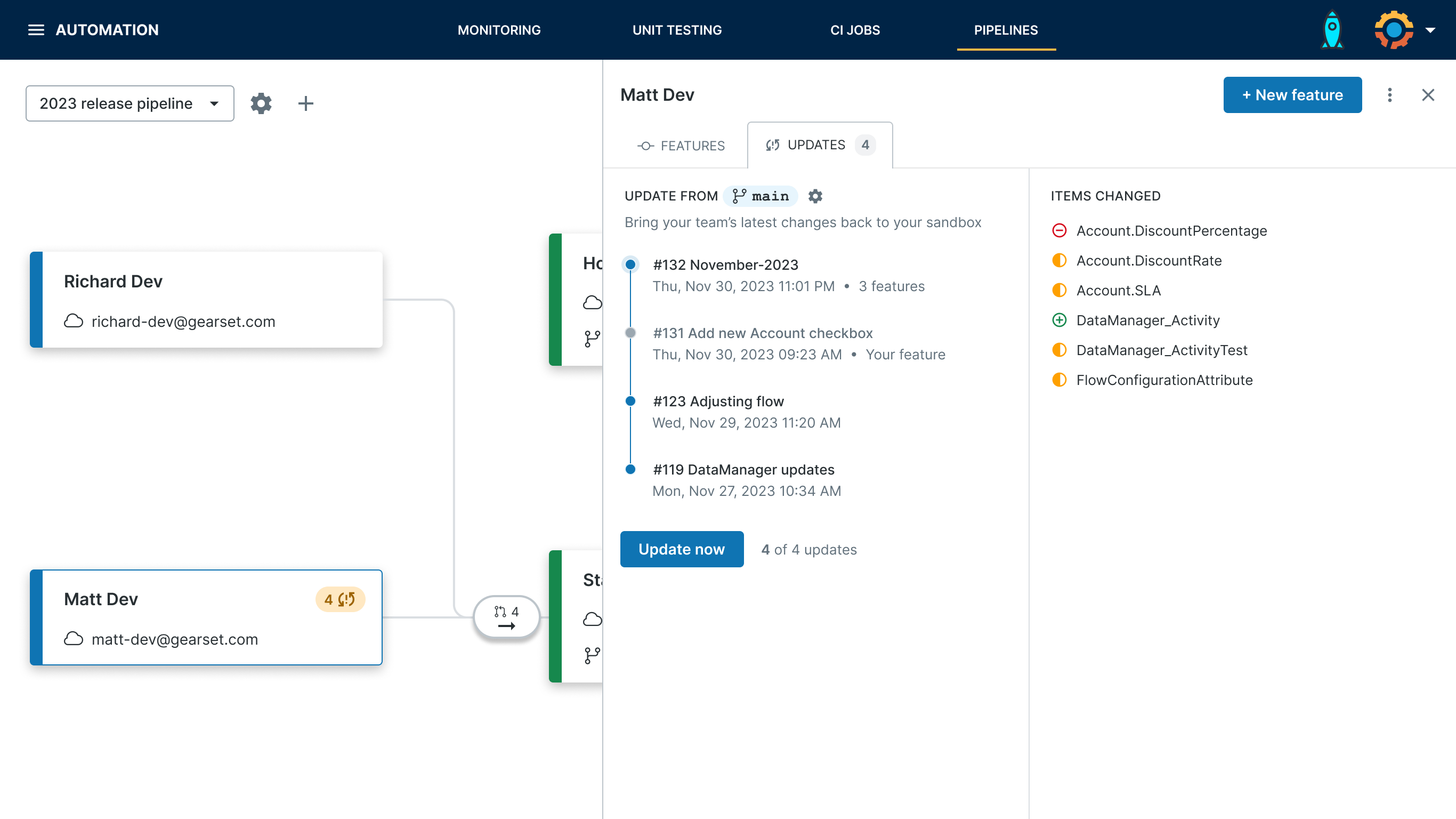 Here’s where setting up CI/CD using Gearset’s Pipelines is a game changer. Gearset tracks any promotions to the main branch and will list them as updates that can be back promoted to your developer sandbox in one click.
