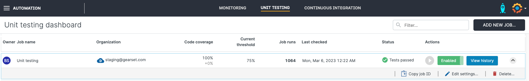 Your new job will first run automatically at the scheduled time, and then every 24 hours. All results will be saved in your test history for easy access, and you’ll receive notifications of the overall test status (passed/failed). From the Unit testing dashboard, you can see all the relevant details of your production tests at a glance, including code coverage. You can also run all unit tests on demand at the click of a button.