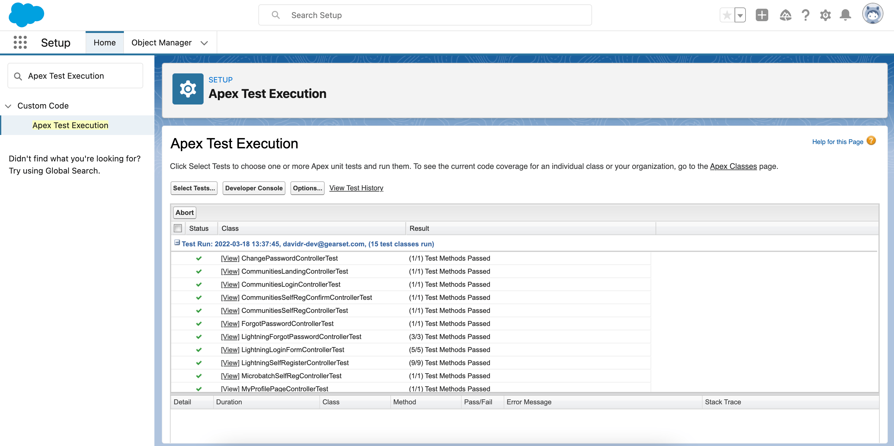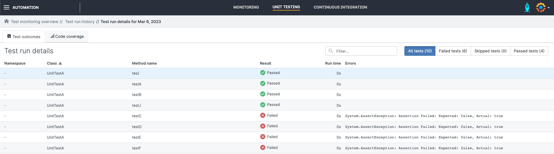 From the Unit testing dashboard, click View history for your unit testing job. You’ll see a full test history for that org, showing you the test status at daily intervals, as well as code coverage stats. In this case, there’s a test that’s been failing for the last few days.